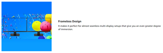 • Frame less design gives an almost-seamless multi-display setup view and 178 degree wide viewing angle panel paired with an ergonomic tilt provides great immersion and better viewing