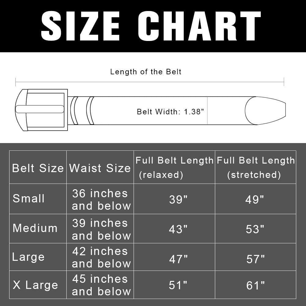 Q: How long are these mens belt? How do I choose the elastic belt that suits my waistline? LENGTH OF MENS BELT: 39in (100cm)-49in (130cm), recommended for waist size under 36 inches./ 43in (110cm)-53in (135cm), recommended for waist size under 39 inches./ 47in (120cm)-57in (145cm), recommended for waist size under 42 inches./ 51in (130cm)-61in (155cm), recommended for waist size under 45 inches.
