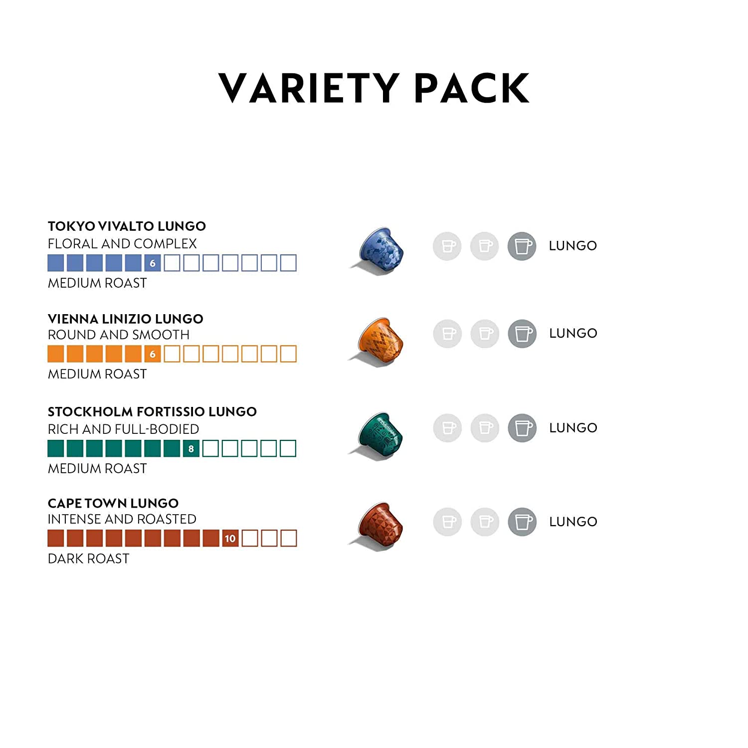 INTENSITY: This assortment will let you explore the rich tastes of the following Nespresso Capsules: Vienna Linizio Lungo (Intensity 4), Stockholm Fortissio Lungo (Intensity 8), Cape Town Envivo Lungo (Intensity 9) & 10 Tokyo Vivalto Lungo (Intensity 6)