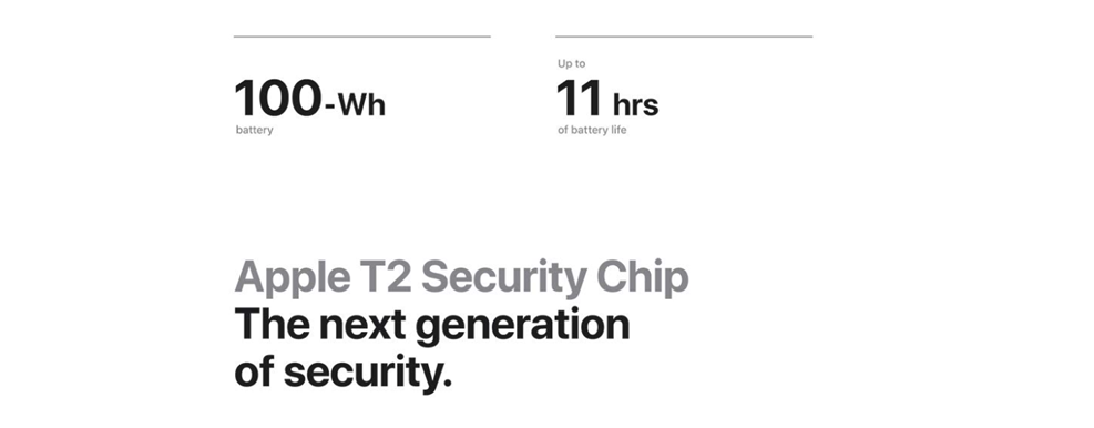 | Charging and Expansion | Four Thunderbolt 3 (USB-C) ports with support for: Charging, DisplayPort, Thunderbolt (up to 40 Gbps), USB 3.1 Gen 2 (up to 10 Gbps) |