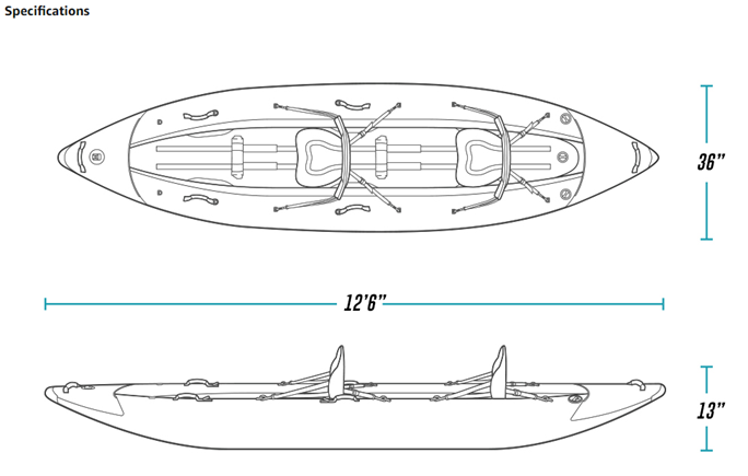 - SIT IN TANDEM KAYAK SPECS: Exterior 12.6’(L) x 38”(W) x 13”(H) / Weight: 28 Lbs. / Capacity: 600 Lbs. 2 Adults + child, gear or a furry friend / Inflation Pressure: 3 PSI (side tubes) & 6 PSI (floor)