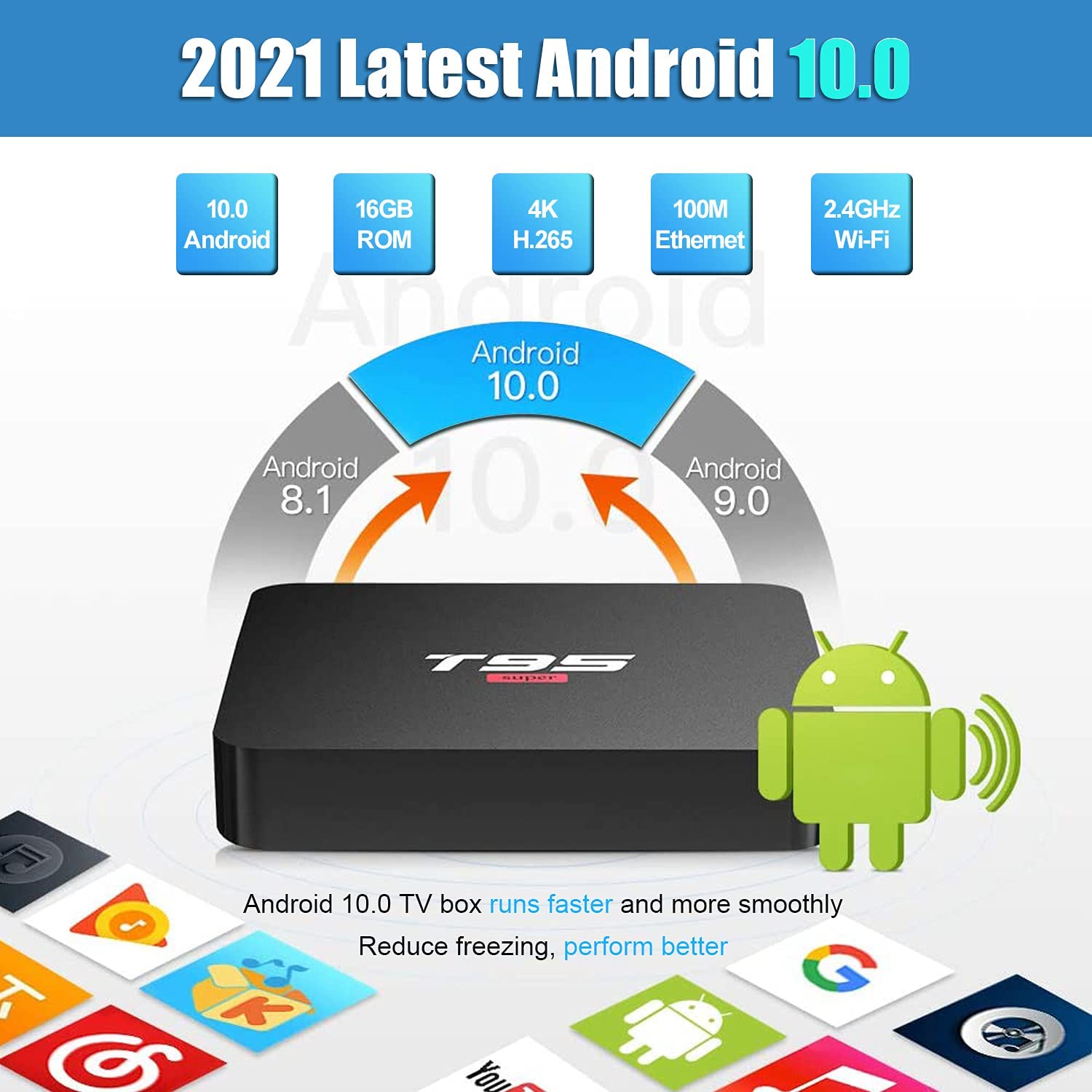 【Android 10.0 TV Box】The T95 Super Android TV box comes with the latest Android 10.0 OS, which is compatible with more apps. With powerful quad-core H3 chipset, the smart box runs faster, smoothly and freezes less. It is perfect for home theater, entertainment, office work, business meetings, etc.