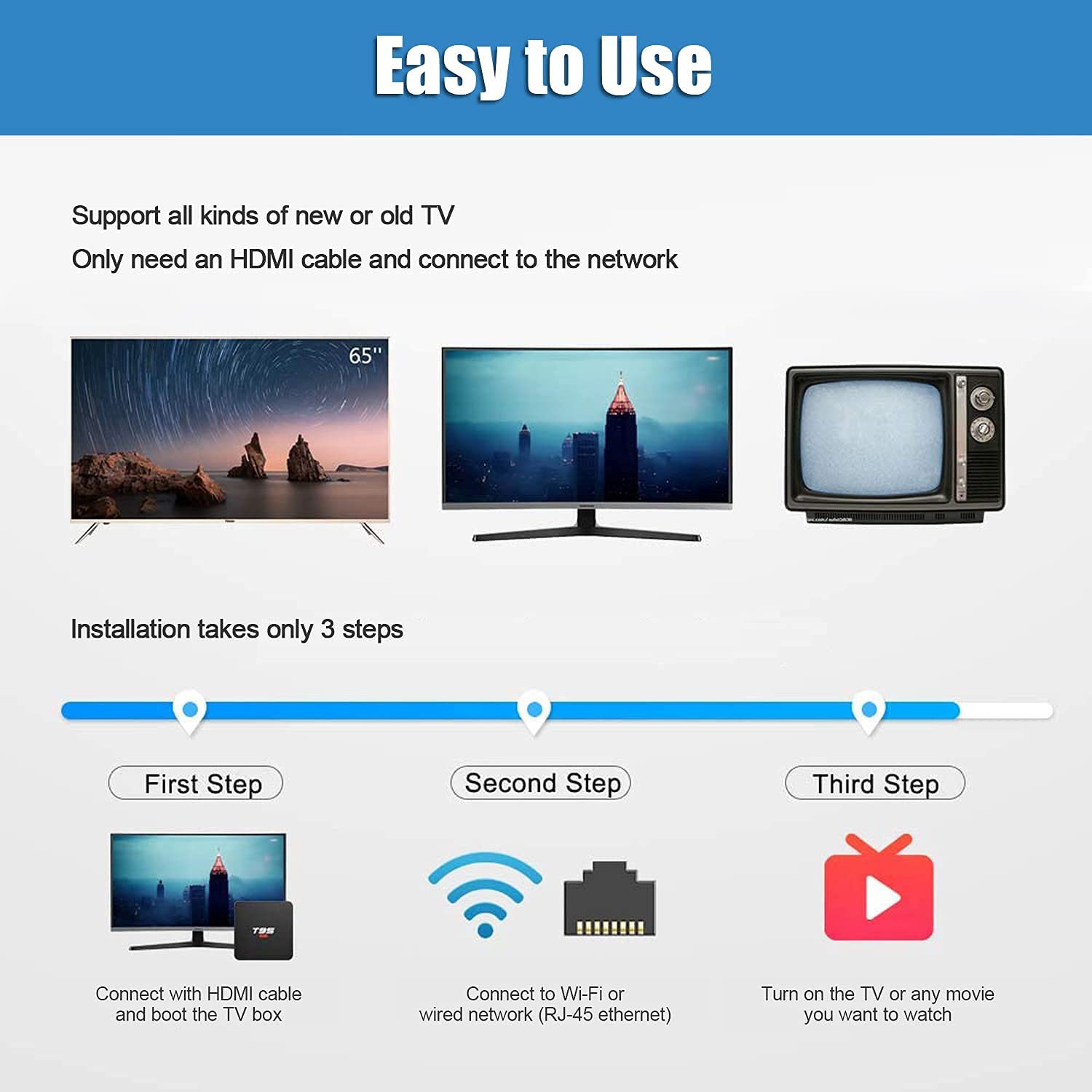 【Easy to Use】The T95 Super Android TV box is easy to use. It can be used with old TV or even in any country, only need an HDMI cable and connect to the Internet/Wi-Fi. It supports changing wallpaper and updating the firmware online.