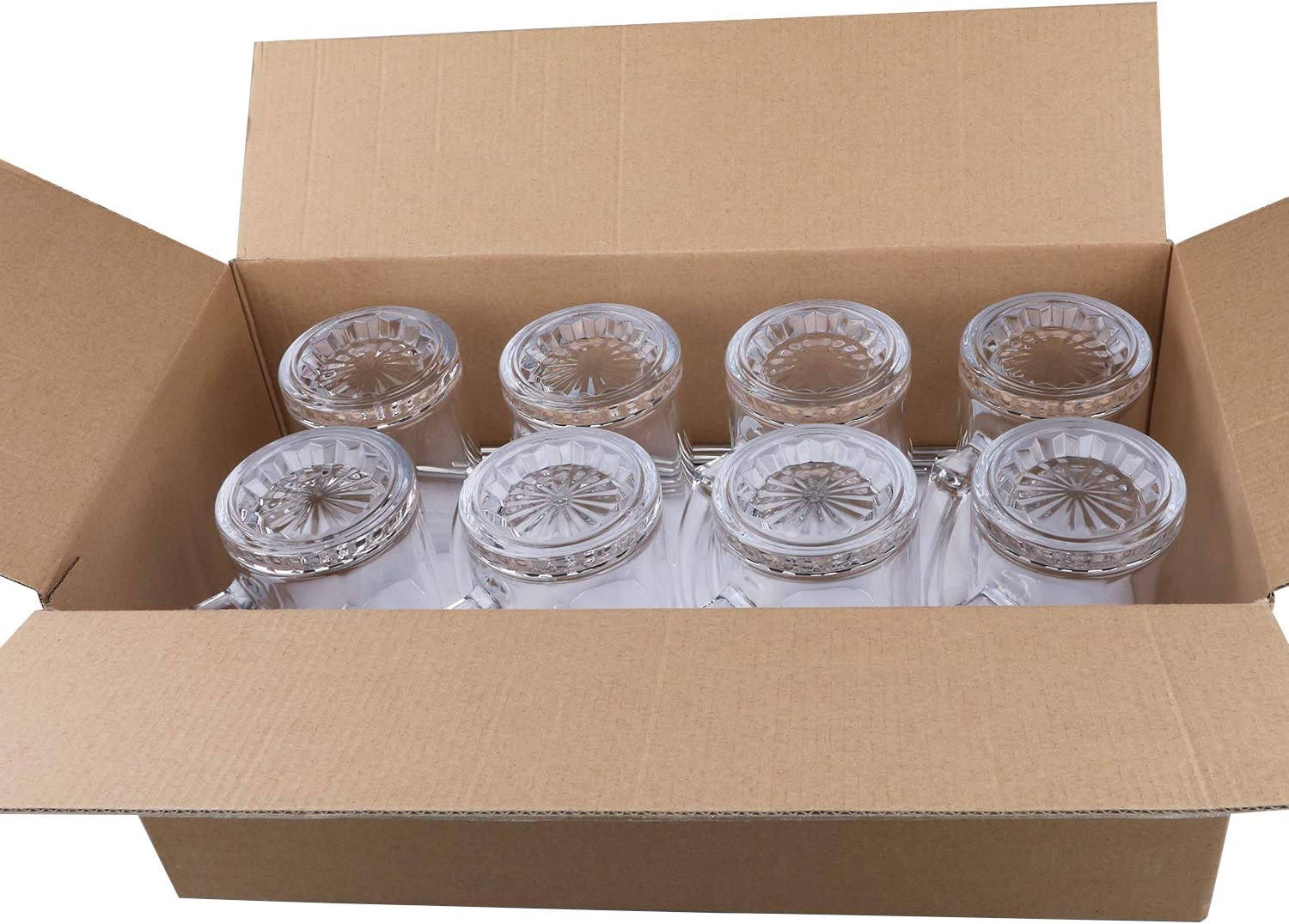 Value Set:Comes 8 pack in safty package,hold 16oz,dimension 3.15inch*3.15inch*5.98inch,clear glass beer mugs with handle,and comes with 8 pieces stanless steel straw for free gift,reusable