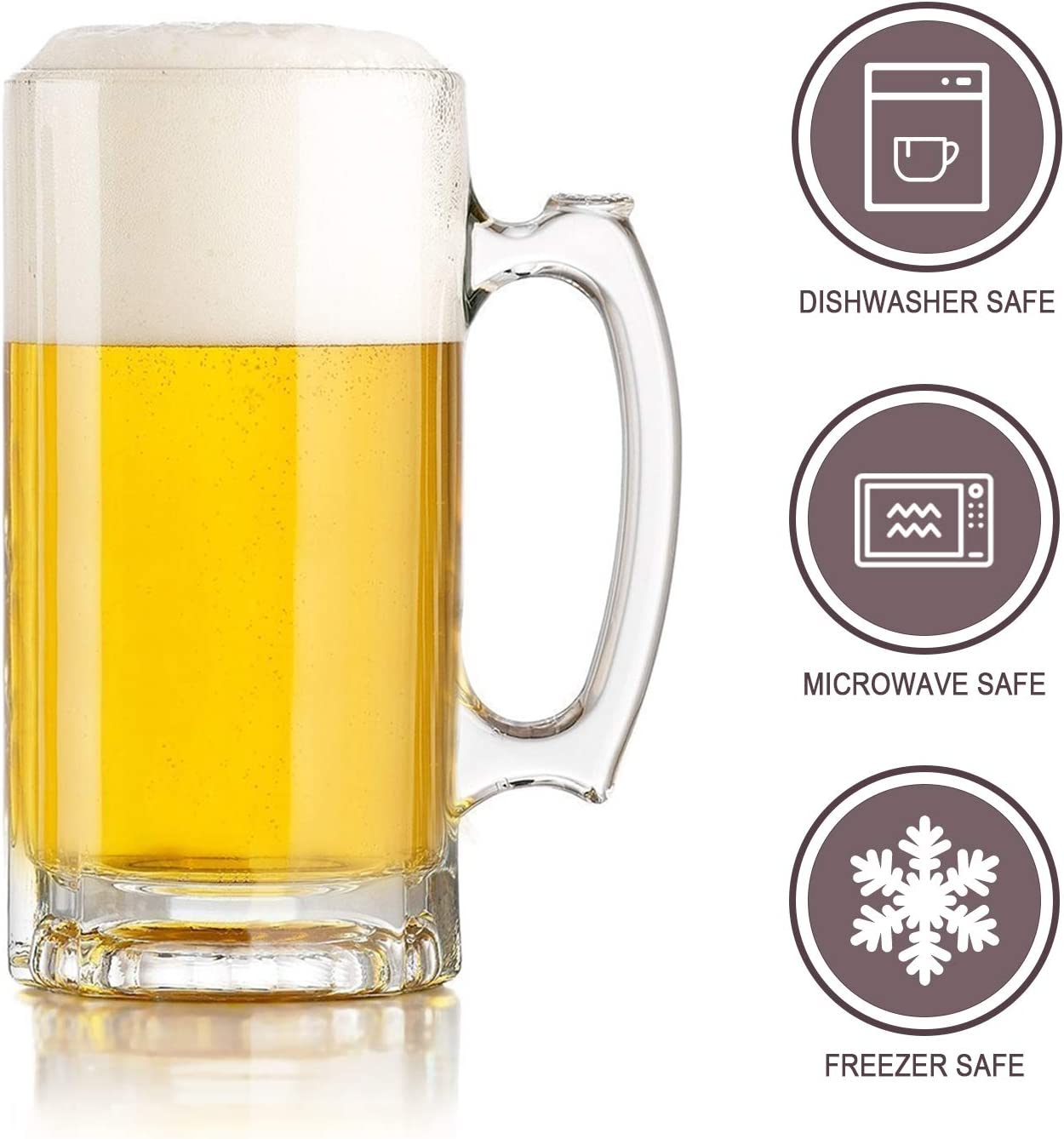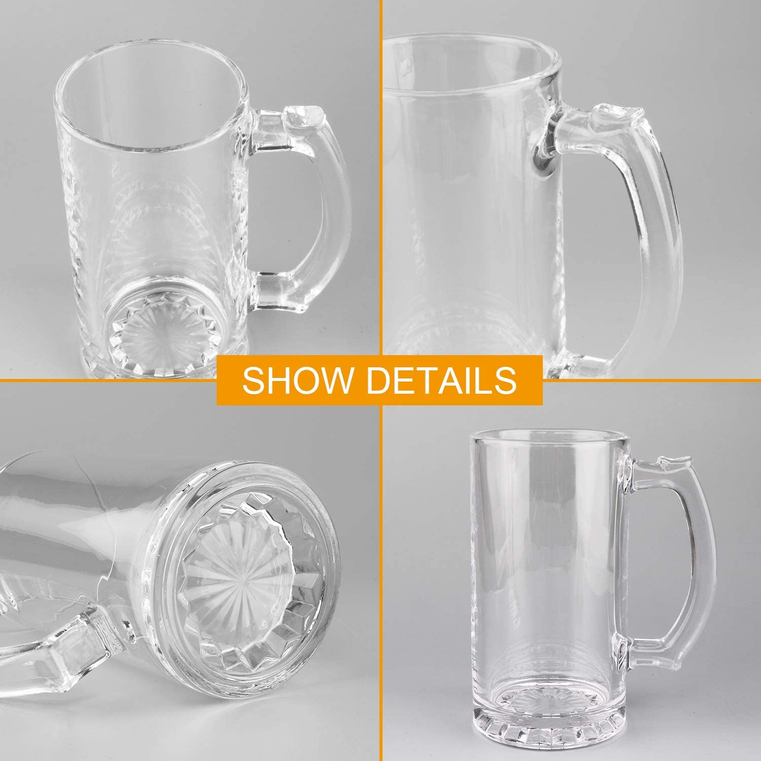 Classic Design:Easy hold handle design which is easy to take up and down,feeling no heavy with beer full inside!heavy base,clear glass,round tall looking is so elegant and saft to use,cylindrical shape,wide handle,thick,everything is excellent on it !