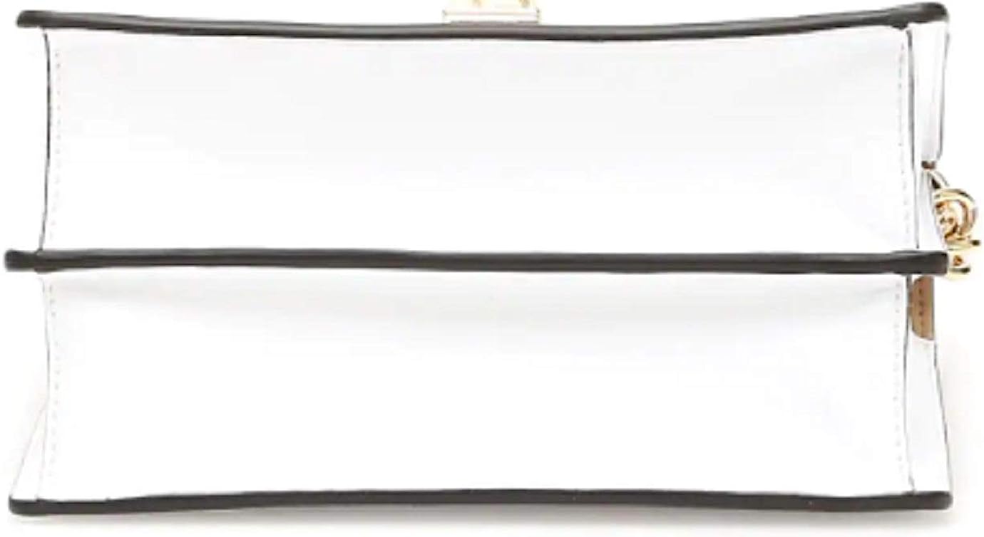 • This shoulder bag is crafted of smooth calfskin leather in white. This shoulder bag features faux beige and burgundy flowers on scalloped edges, a shoulder strap and polished gold rings on the anchor to hold bag charms.