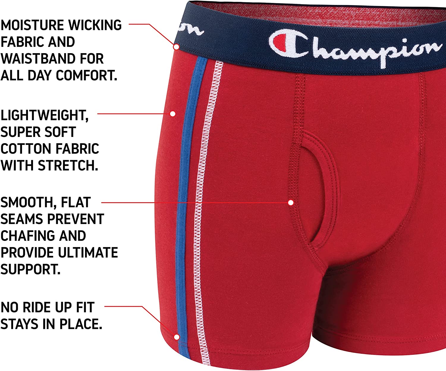 - PACK CONVENIENCE – Value pack comes with four Champion boys’ boxer briefs in assorted colors, including a Champion C and script logo all-over print.