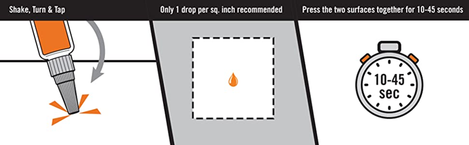 5) Secure: Press the two surfaces together for about 10-45 seconds. Note that gaps and uneven surfaces may cause delayed bonding. Wait 24 hours for a full cure.