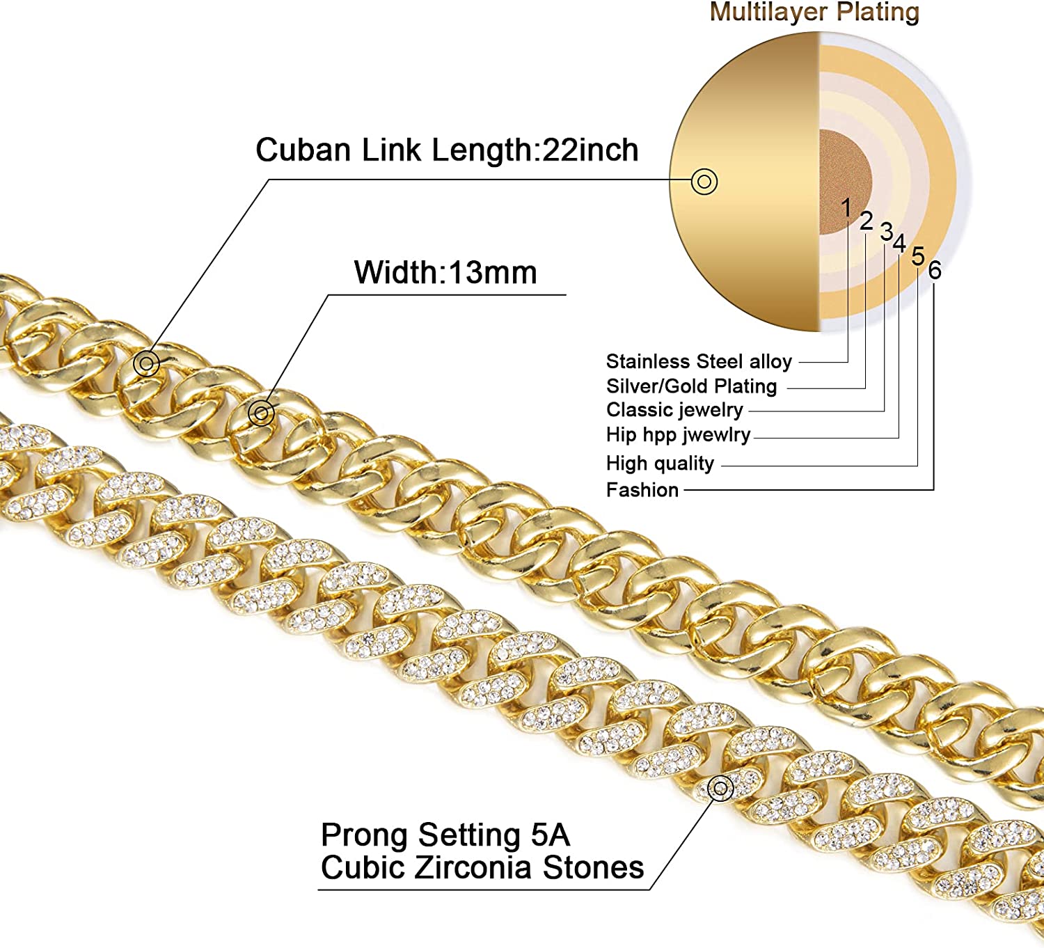 • Cuban Necklaces chain length: 8.5inch,18inch, 20inch, 22inch, 24inch,Chain width:13mm,Everybody size are different, we suggest you tie a string and measure it,after you can choose fit your size