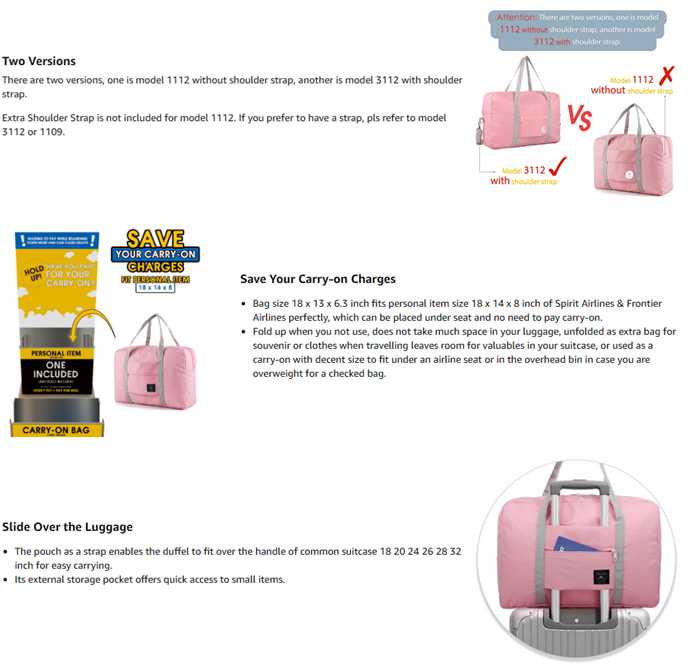 ✅ EASY CARRYING - Its external storage pocket offers quick access to small items. The pouch as a strap enables the duffel to fit over the handle of common suitcase 18 20 24 26 28 32 inch for easy carrying.