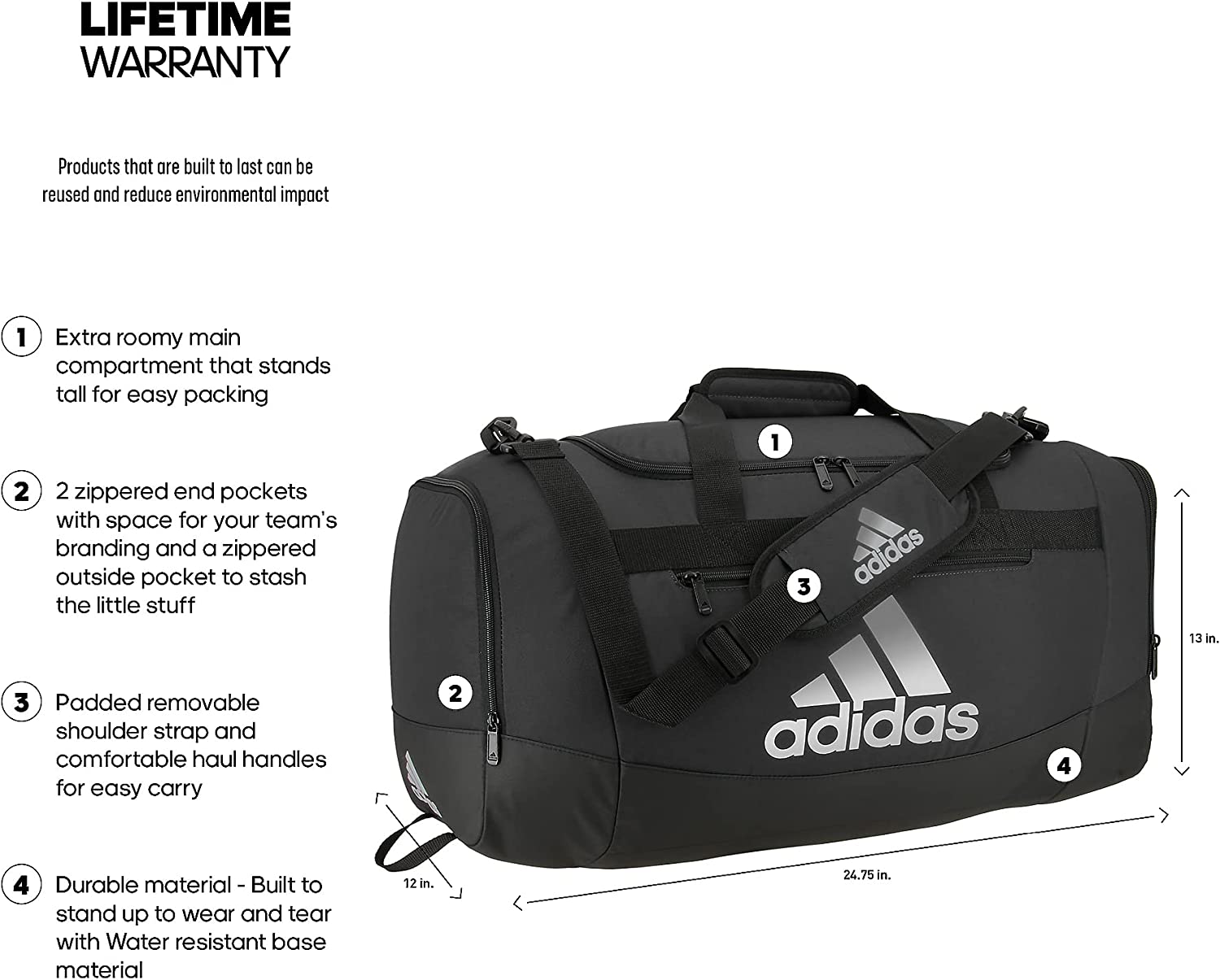 100% Polyester   Imported  Polyester lining  Zipper closure  Hand Wash  Lifetime warranty.  Water resistant base material.  Extra roomy main compartment that stands tall for easy packing. 2 zippered end pockets with space for your team's branding and a zippered outside pocket to stash the little stuff. Durable material - built to stand up to wear and tear. Show more