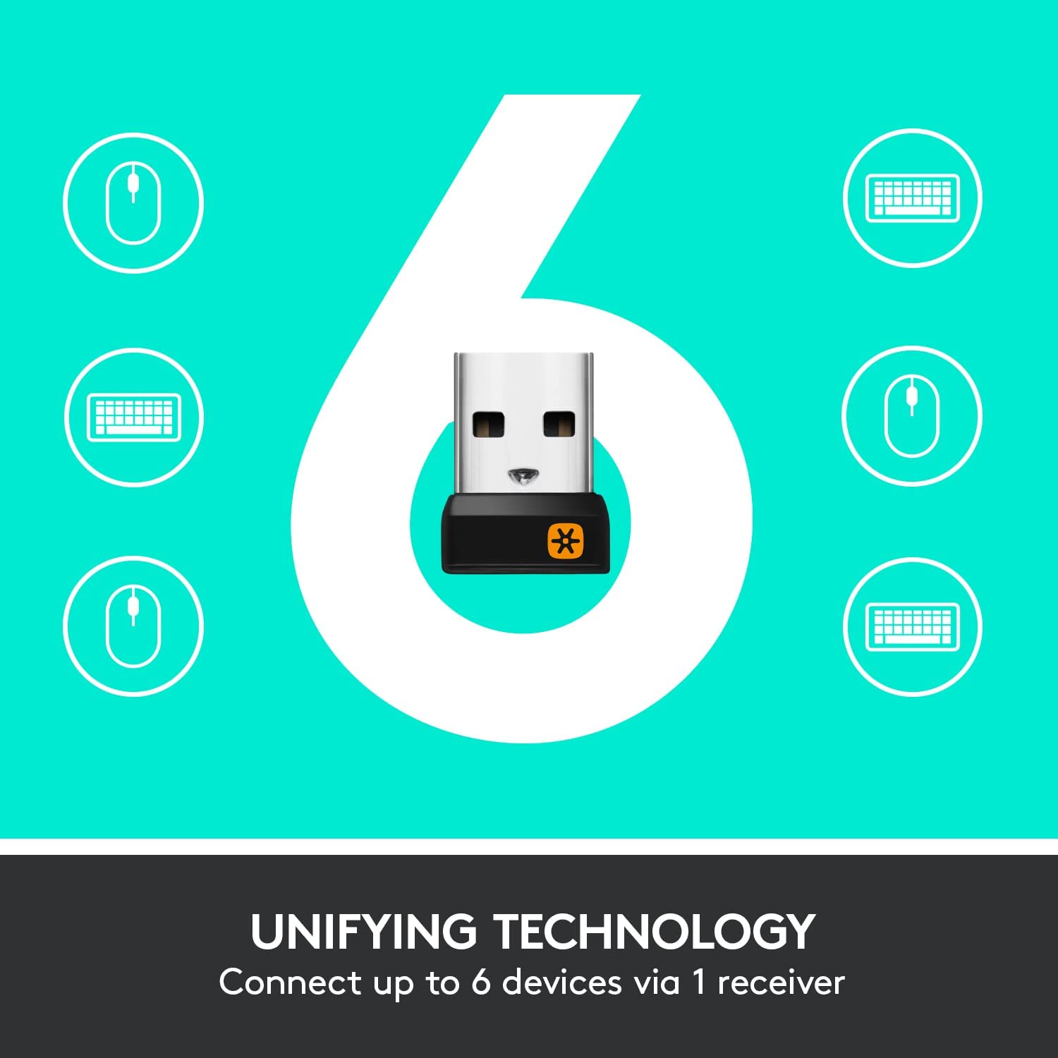 • Wireless Freedom: One tiny unifying receiver pairs up to 6 compatible devices; creating a clutter-free workspace; the USB receiver provides a strong; reliable connection within up to 33 feet (3)