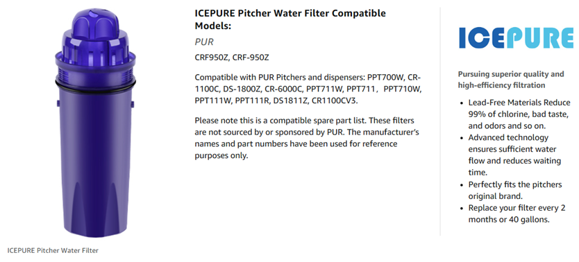 • ?????????? ??????‒ PUR pitchers and dispensers: PPT700W, CR-1100C, DS-1800Z, CR-6000C, PPT711W, PPT711, PPT710W, PPT111W, PPT111R, DS1811Z, CR1100CV3 and more. This compatible spare part list and the manufacturers' names and part numbers has been used for reference purposes only. ICEPURE is an independent brand.