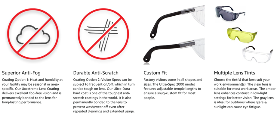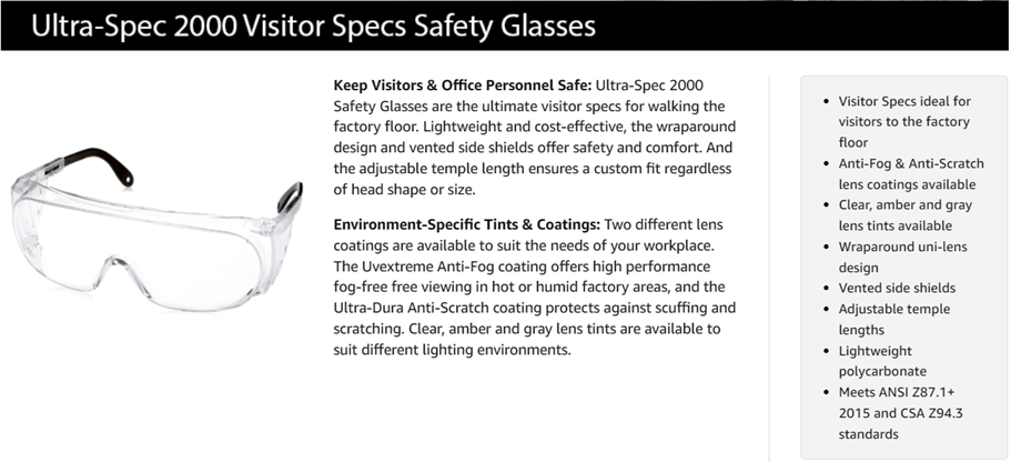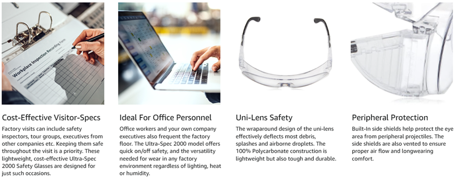 • IDEAL VISITOR SPECS: Ultra-Spec Safety Glasses are ideal for use by office workers entering the factory floor and by guests during plant visits, factory inspections, tours etc; fits most face shapes and sizes; meets ANSI Z87.1plus 2015 and CSA Z94.3 standards