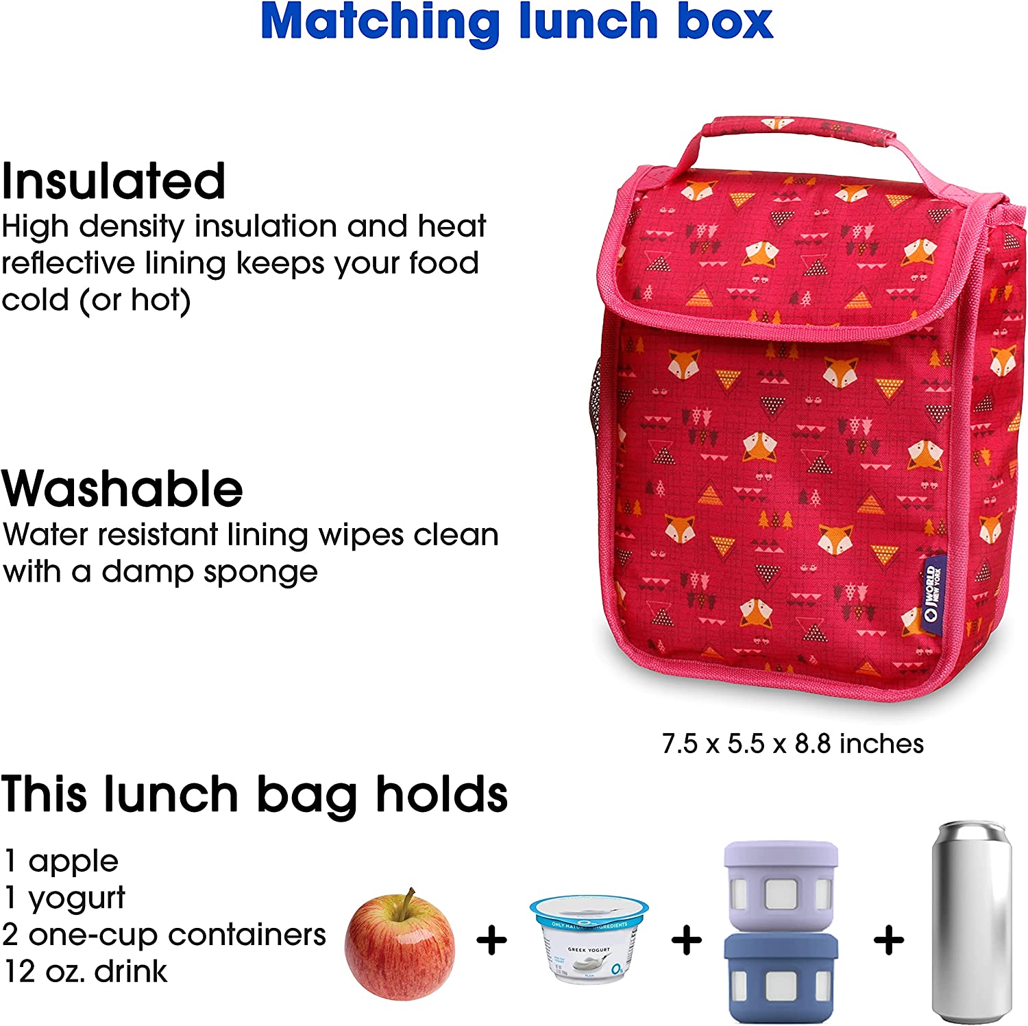 - Insulated Lunch Bag — Included lunch bag for kids keeps food at the right temperature. Holds a sandwich, drink, snack, and ice pack. Measures 10 x 8 x 4 inches