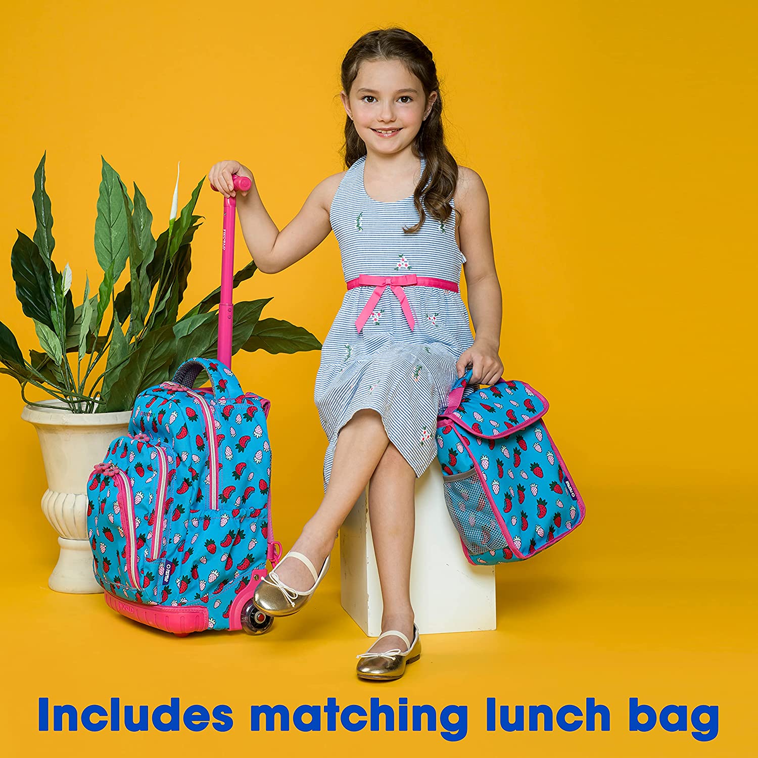- Kids Rolling Backpack and Lunch Bag — Functions as both a bag on wheels for school and a fun carry-on backpack for kids ages 3-9 years. Comes with matching lunch bag