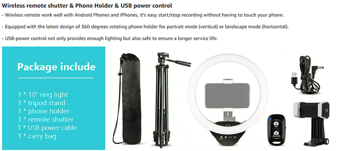 - 【Versatile Accessories】 The USB-powered control helps protect your safety while improving the ring light’s brightness. The phone holder is spring-loaded and extends up to 5.3" wide, it is compatible with almost ALL smartphones with or without a case.