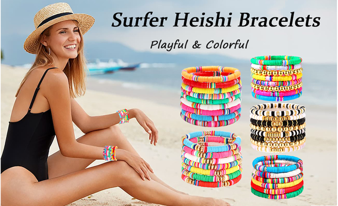 - ★ Heishi Bracelets Set -- For beach jewelry, we love a mix color of effortless layering bracelets. Bold and vibrant, the Bohemia bracelets are consist of 6mm colorful African vinyl disc beads and gold-tone metal sequins on elastic bands. One package including 9 strands of heishi bead bracelet, playful, colorful and stretch, can easily go with everything this summer