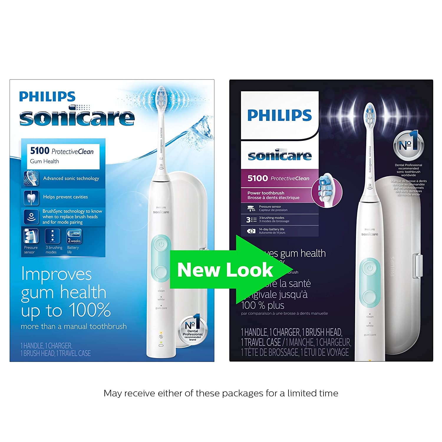 Improve your gum health up to 100% better than a manual toothbrush with the Philips Sonicare ProtectiveClean 5100 rechargeable electric toothbrush. It has a pressure sensor that protects teeth and gums from excess brushing pressure. Brush heads wear out over time. Our BrushSync technology tracks how long you have been using your Optimal Gum Care brush head and how hard you have been brushing. Your electric toothbrush will beep to inform you when to replace your brush head. Customize your own brushing experience with your choice of 3 modes: Clean, White and Gum Care. The easy-start feature slowly increases the power of the brush as you get used to the Sonicare experience and the SmarTimer encourages a full 2 minutes brushing time as recommended by your dental professional. The battery charge indicator light lets you know when it is time recharge; 2 week battery life. The kit includes 1 White ProtectiveClean 5100 handle, 1 Optimal Gum Care brush head, 1 white charger, 1 white travel case. Subscribe & Save on genuine Philips Sonicare brush head replacements and save up to 15%.