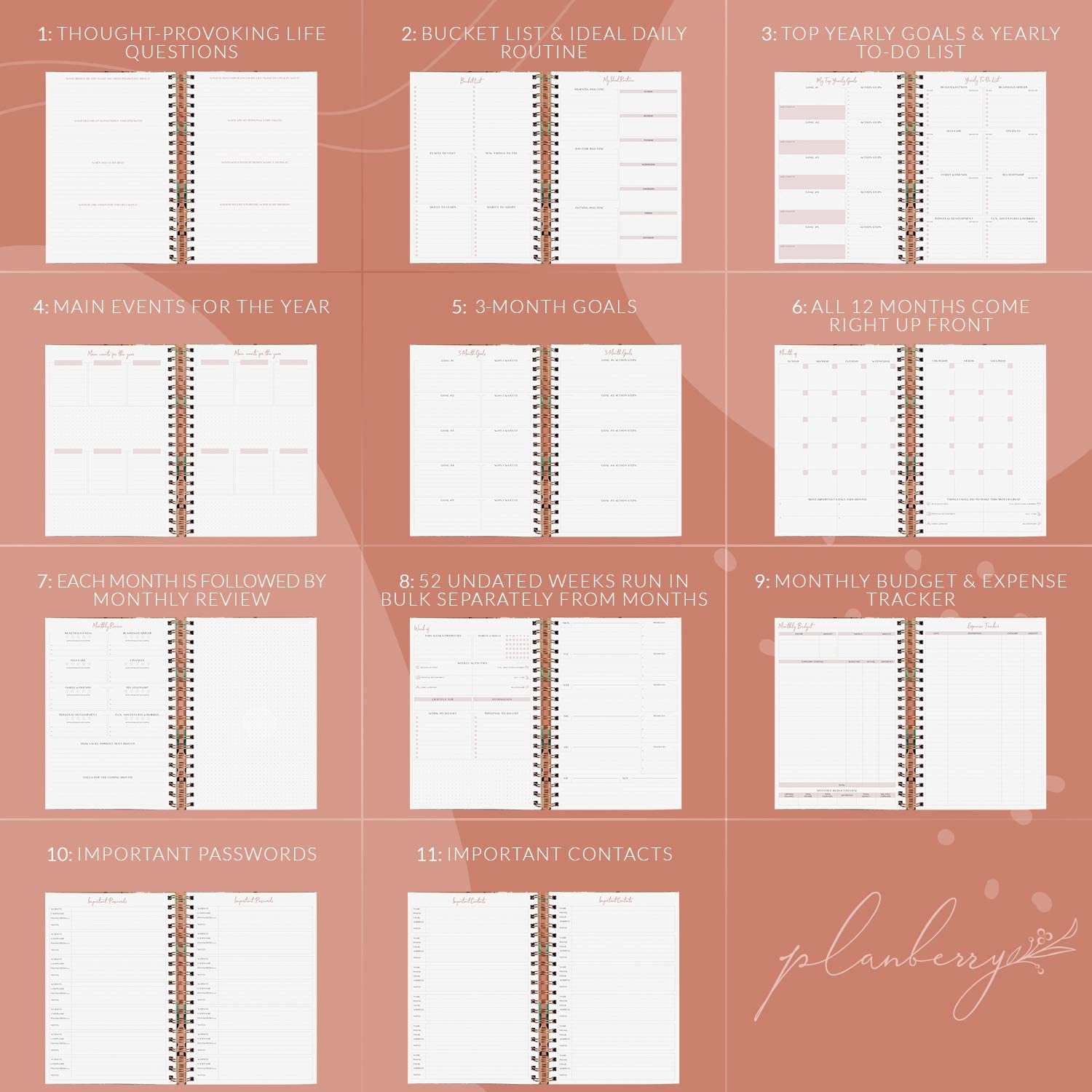 - ✓ MANAGE YOUR AGENDA & FINANCES WITH ONE PLANNER - PLANBERRY Large Undated Weekly Planner is an all-in-one tool that combines a detailed weekly task planner and a comprehensive monthly budget planner. Moreover, there is a yearly goals section, an events calendar, password and contact books, and many other tools to help you live every day to the fullest. Using all these, you can manage all areas of your life simultaneously and ensure you always stay one step ahead, whatever life throws at you.