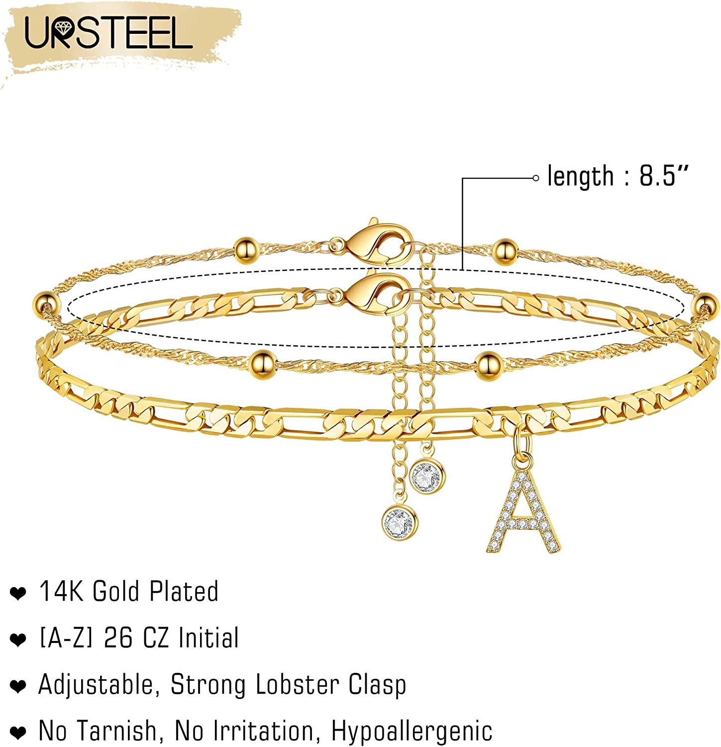 - MATERIAL: Initial ankle bracelet made of 14k gold plated, nickle and lead free, waterproof, will never fade, rust, stain, corrode, or turn skin green.