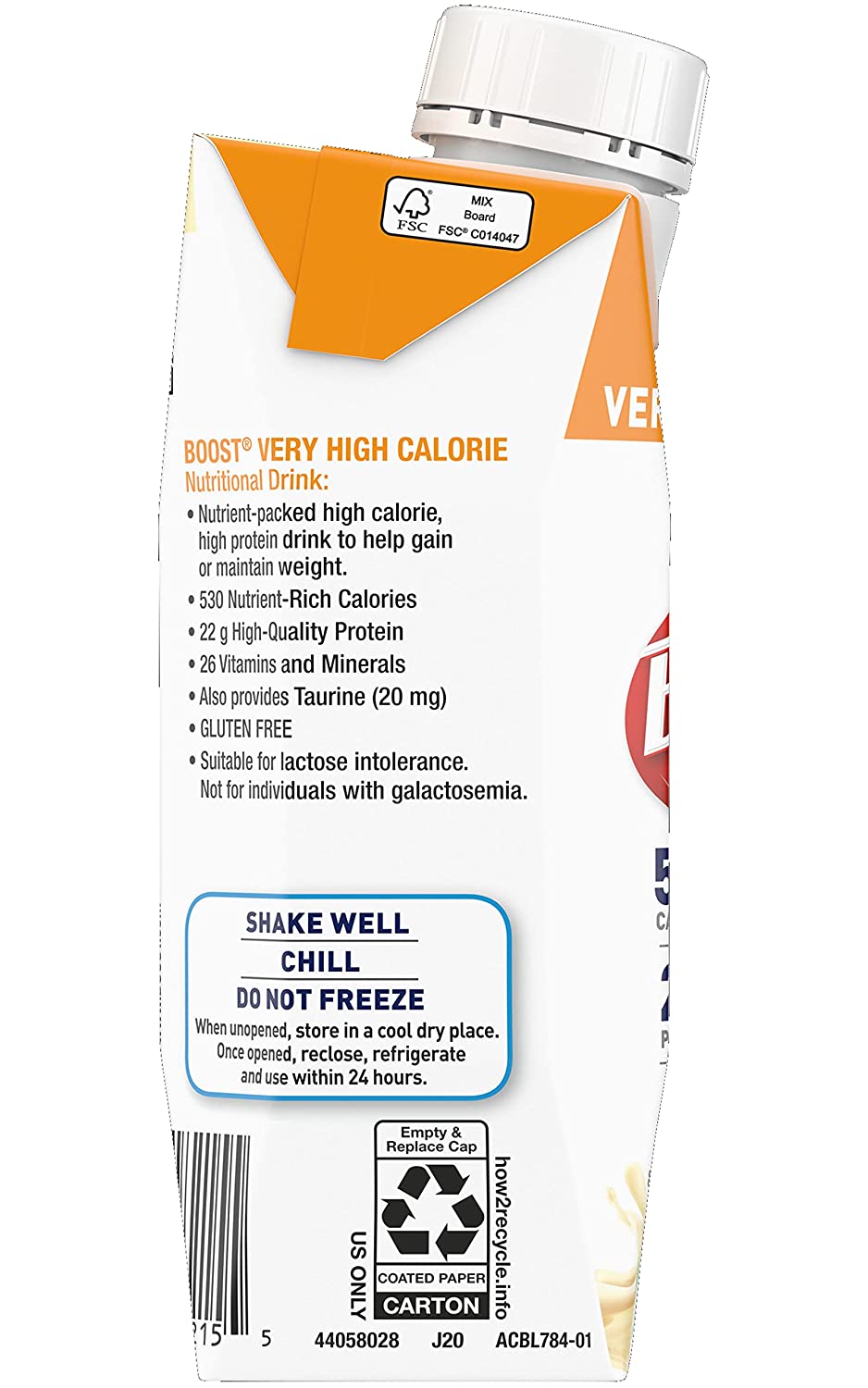 • COMPLETE BALANCED NUTRITION: BOOST Very High Calorie is a calorically-dense balanced nutritional drink & can be used as a snack or mini meal.