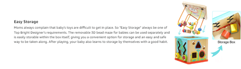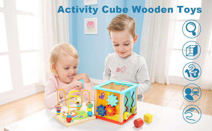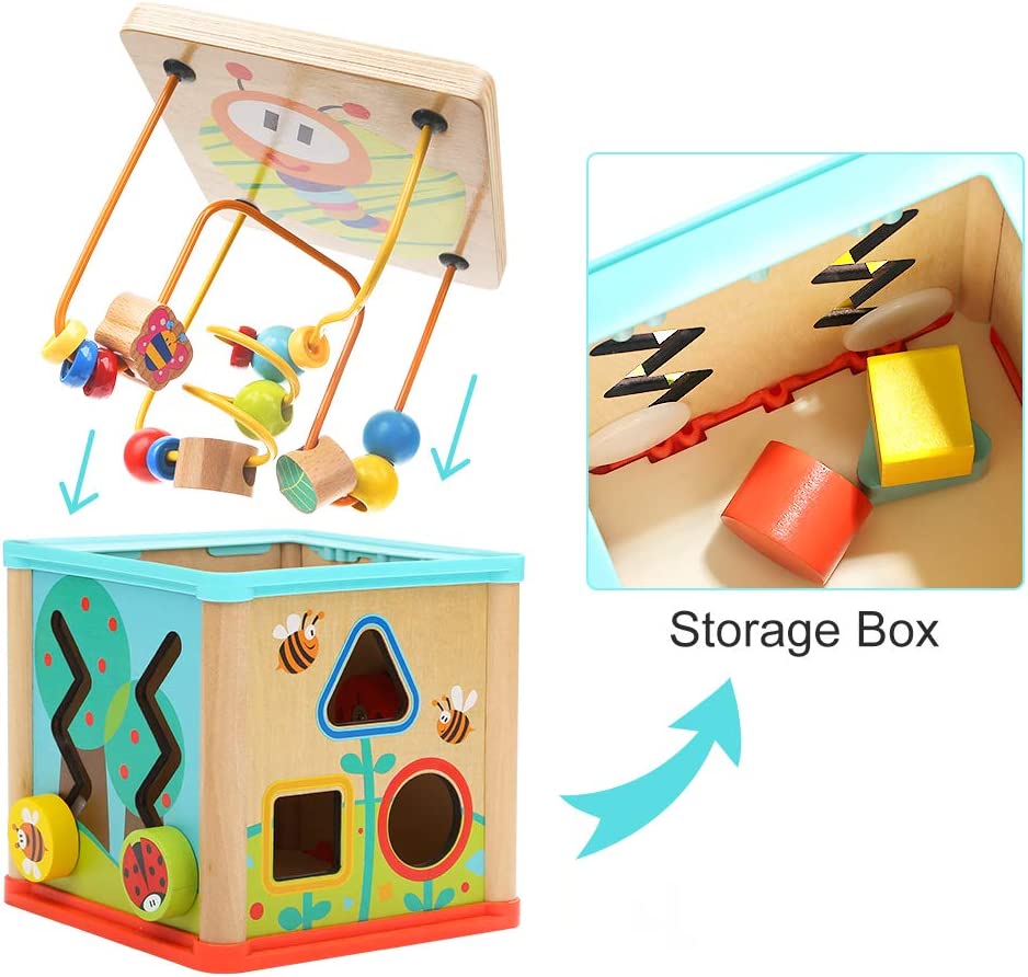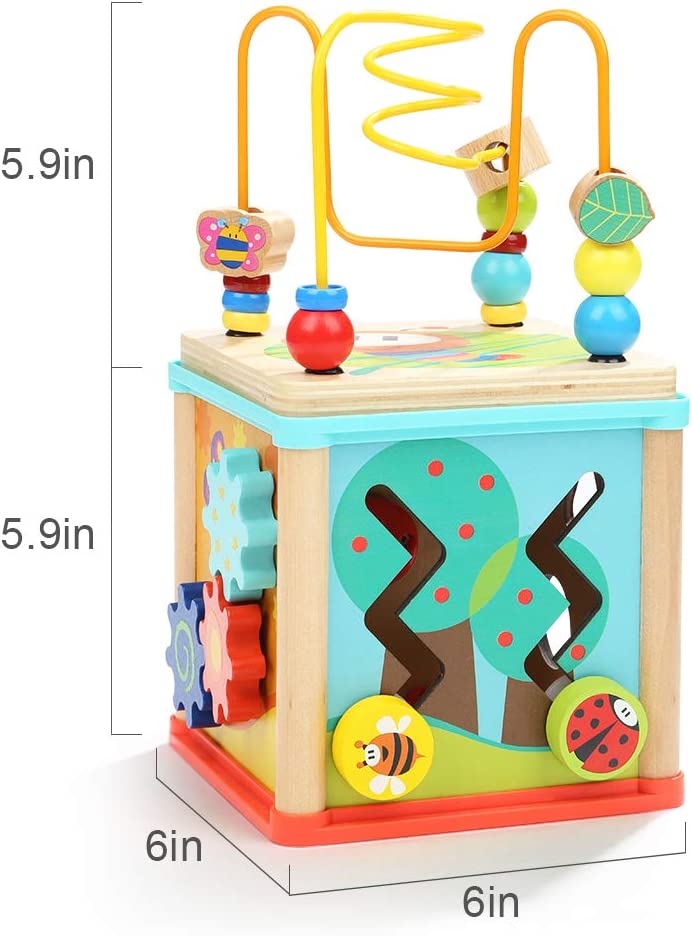 • Portable & Easy store - The top bead maze can be played separately, also flips over and fits inside the box for easy storing. This makes the whole wooden toy easily portable and excellent for toddler travel toy. Activity cube size: w: 6 x d: 6 x h: 5.9 inches.