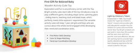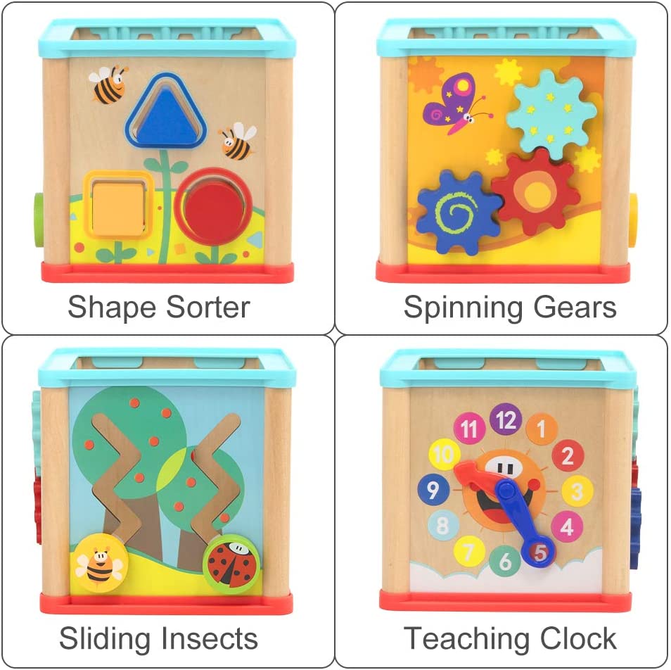 • 5 In 1Activities - Our activity cube for 1 year old combines 5 different activities in 1. Bead maze, Learning clock, Shape sorter, Spinning Gears and Zig zag sliding side. This development toy keeps children busy and entertained, while developing their logical thinking, imagination and creativity.