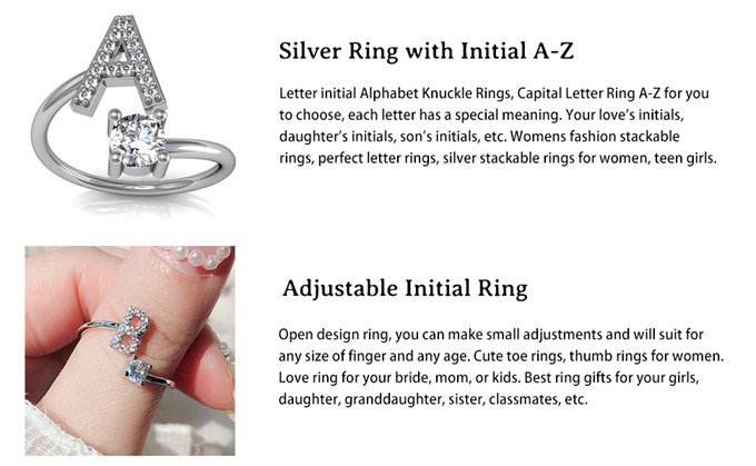 - SILVER RINGS FOR WOMEN: Crystal inlaid copper ring with multilayer plating process. 26 initial 3D wrap ring, choose the Alphabet Ring, which is important for you. your first name,your kid's name, your teens' name, your lover's name, daughter's name, mom's name,etc.