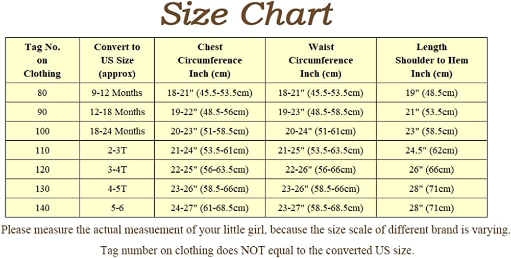 Size for baby and toddler girls: 6-12 months, 12-18 months, 18-24 months, 2T to 3T, 3T to 4T, 4T to 5T and 5-6. Age is only an approximation of size. Please measure the actual body size and refer to the size chart to choose a proper size for best fit. There may be minor size difference depending on size measuring method.