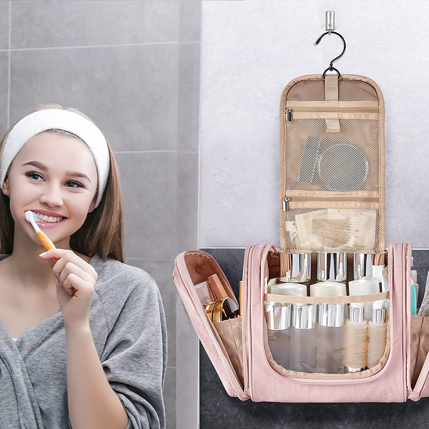 Special Design - Inner pockets with elastic straps hold bottles upright. Two side pockets of travel toiletry bag can keep the wet/dry items separated. The right side pocket with PVC material is easy to clean and dry, perfect for makeup brushes, toothbrushes, wet towels. Stow-away 360 degree swivel non-slip metal hook for versatile hanging options.Can be gifts for Women on Black Friday,Cyber Monday,Christmas day.