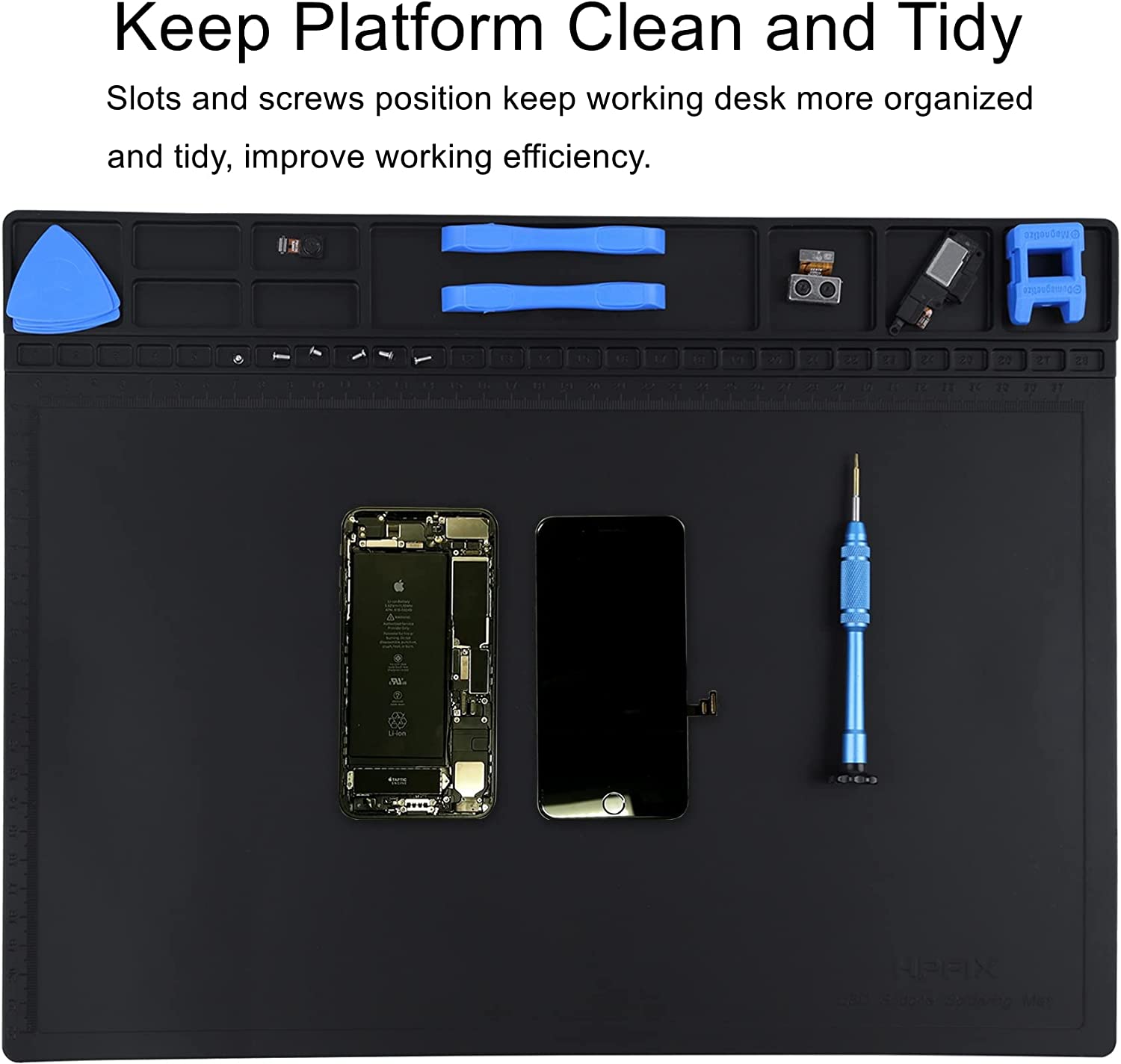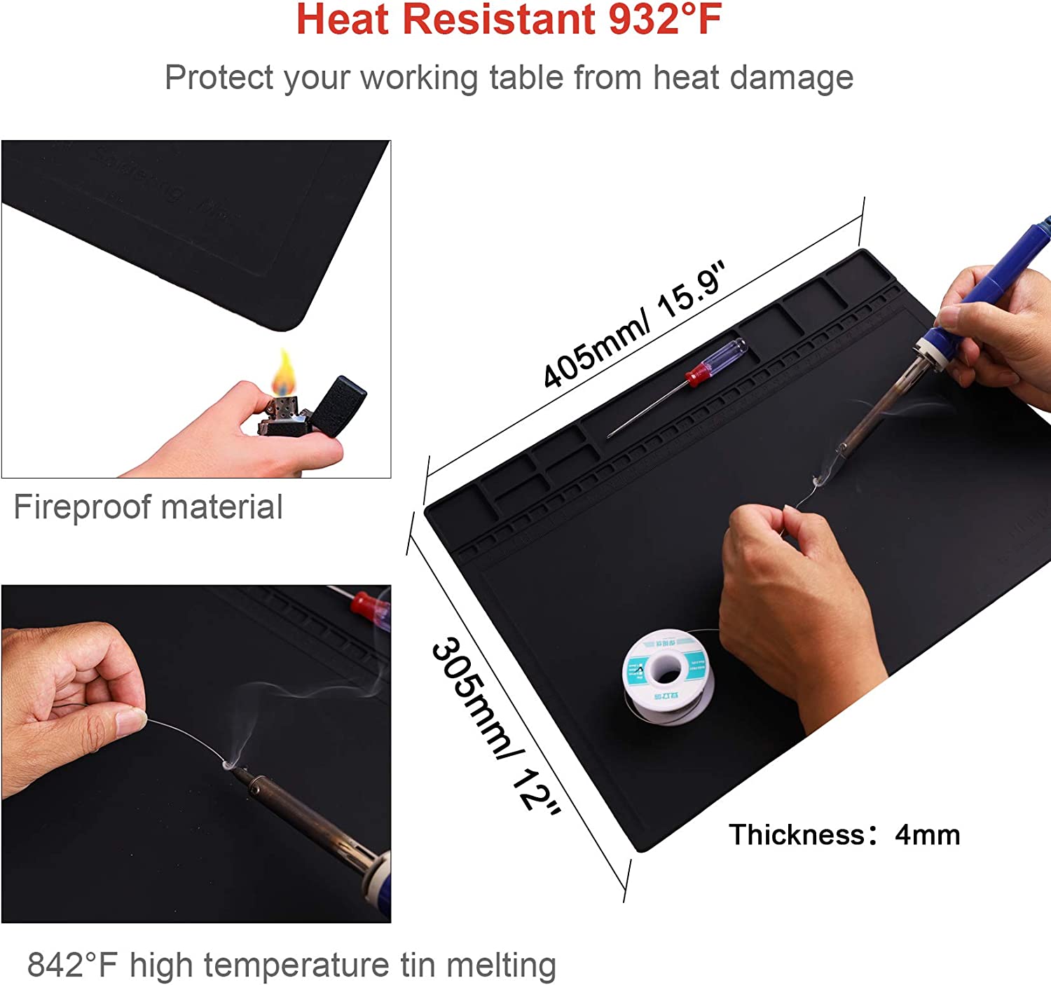 • ?【Heat Resistant 932°F and Big Size 】-The anti-static mat is resistance to high temperature of 932°F protect your desk from burning and ruining. Compared with rubber materials mat, it has better heat resistance at high temperature. Meanwhile, the Mat has big size 15.9’’ x 12’’provide bigger space to satisfy many projects like for repairing mobile phone, computer circuit board, iPad, camera so on electronics. It’s great for professional repair store, DIY handyman and electronics workshop.