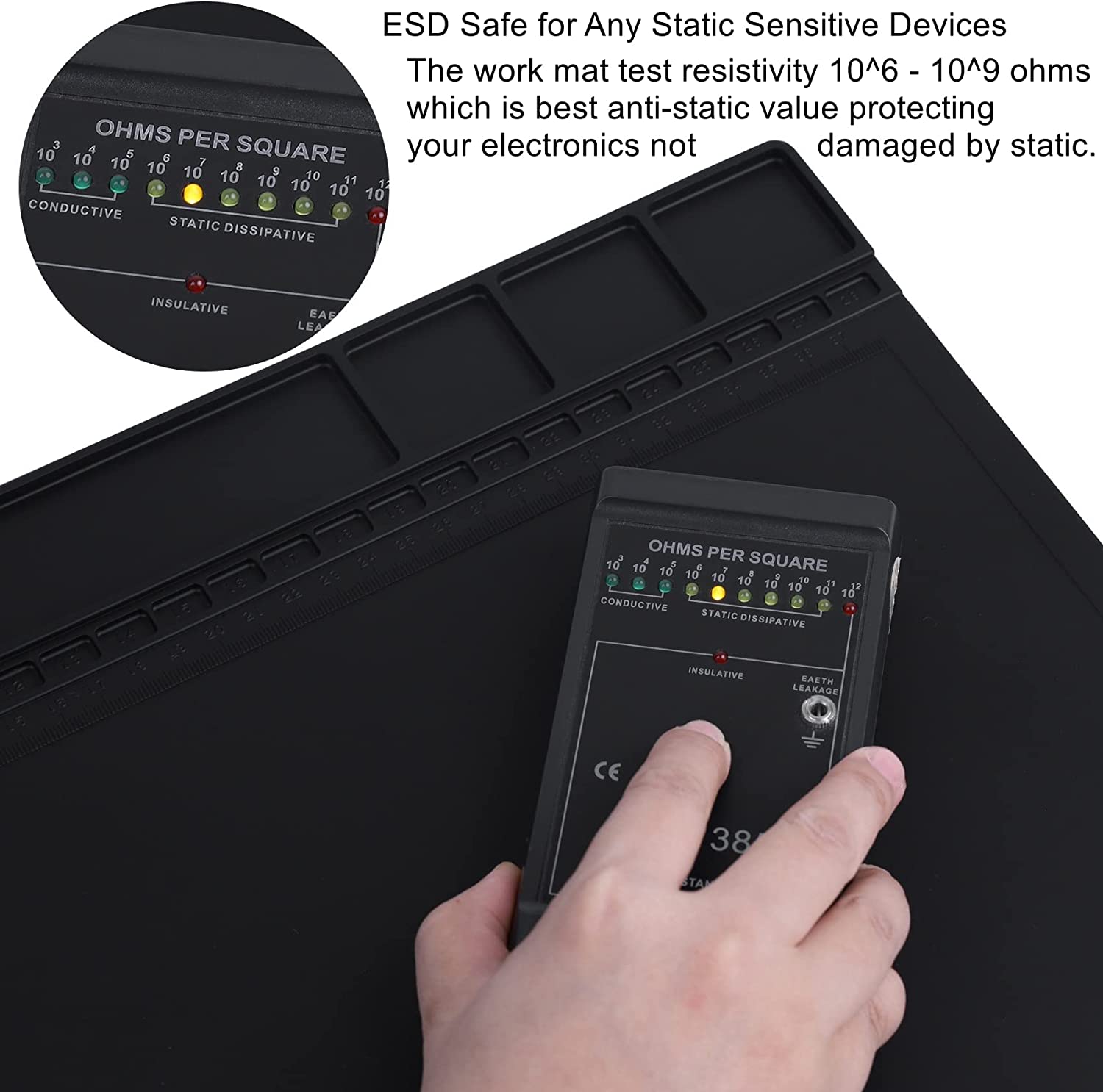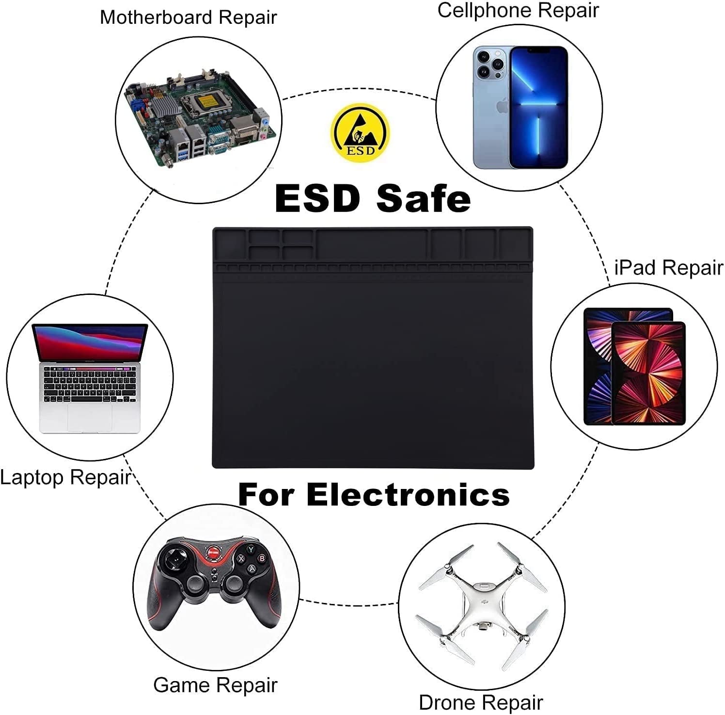 • ?【【 An Ideal ESD Safe Mat 】 - This high quality ESD soldering mat is designed for a better and safer work surface for electronics assembly and repair or soldering, such as for cellphones, computer, tablets, Laptop, iPad , IC circuit boards etc, especially for static sensitive electronic products, our anti-static mat can protect your sensitive electronic devices from static damage. The surface resistivity is between 10 ^ 6 and 10 ^ 8 ohms.