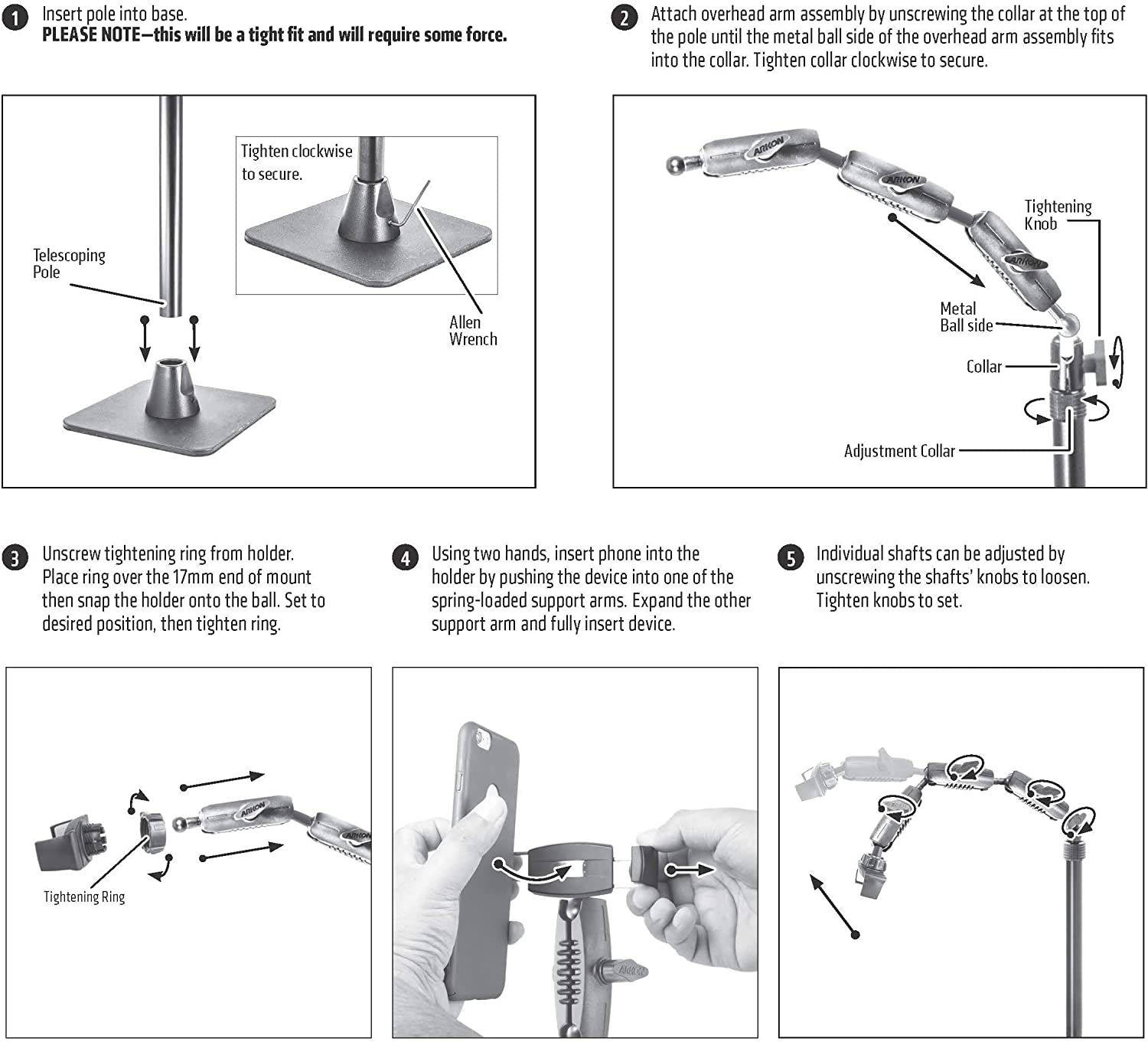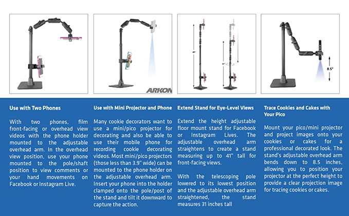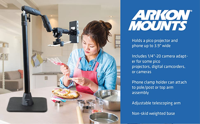 "This unique stand includes two universal holders: one for your pico projector and the other for your phone. Alternatively, it may also be used with two phones for videos, tutorials, or live stream video. PRIMARY USE: Pico Projectors (sold separately by third-party sellers ) are commonly used in the cookie decorating community. Unfortunately, the stands that come with them are usually too short, and are very flimsy. Arkon's Cookie Decorators Mount is different. It's a stand that is height-adjustable up to 43"" tall, allowing you to position your projector at the perfect height every time you use it. Many cookie decorators want to use a pico projector and also be able to use their mobile phone to record cookie decorating videos. This functionality is easy with the Cookie Decorators Mount. Insert your phone into the holder clamped onto the pole/post of the stand and tilt it downward to capture the action. For most pico projectors, the phone holder on the top arm assembly is the best way to grip your projector (those less than 3.9"" wide). However, the Cookie Decorators Mount also includes a camera adapter with standard 1/4""-20 threaded pattern, which is found on all pico projectors, digital video recorders, and cameras. SECONDARY USE: If you own two phones, you can be filming front-facing or overhead view videos with the phone holder on the top arm assembly. If in the overhead view position, you'll be able to use your phone mounted to the pole/shaft position to view the comments or your hand movements in a Facebook or Instagram live. Using two phones is also a great way to capture more than one camera angle for your videos. Both phone holders securely fit phones up to 3.9” wide, including Apple iPhone 11 Pro Max, iPhone 11 Pro, iPhone 11, iPhone XS Max, iPhone XS, iPhone XR, iPhone X, Samsung Galaxy Note 20 and Note 10, Galaxy S20, S10, and S9, and LG G6, G5, and G4."