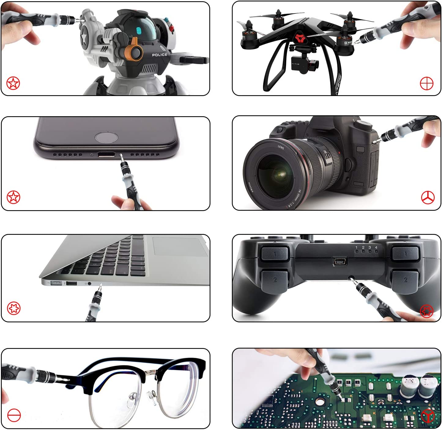 【Home and Workshop Must Have】Everyone have an ambition to the DIY computer or circuit board to let them run better or to repair broken electronics and belongings by self. Such as DIY game computer hardware to play games more smoothly, exchanging an iPhone broken screen, or clean the TV mainboard. This mini screwdriver set includes all the screwdriver bits and essential tools we daily need. It is a great gift for father, son, husband, and friend, the item has 12 months warranty.