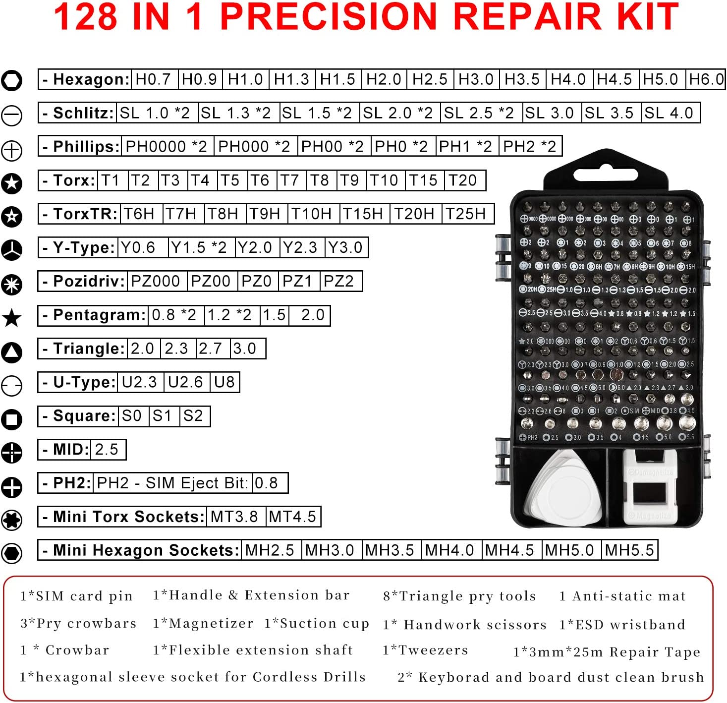 【Multipurpose & Good Compatibility】This precision computer repair kit has 16 types and 98 magnetic bits(Phillips, Ph2, Torx, Five-star, Straight, Pozi driver, Y-type, Torx, Triangle, Hexagon, and Square bits). From the laboratory data, it contains all screwdrivers for iPhone, Samsung galaxy cellphone, laptop, iPad, PC, Nintendo switch Wiiu and ps3 ps4, Xbox series game switch, eyeglass, jewelers, drone, PC, and other electronics which you need to repair.