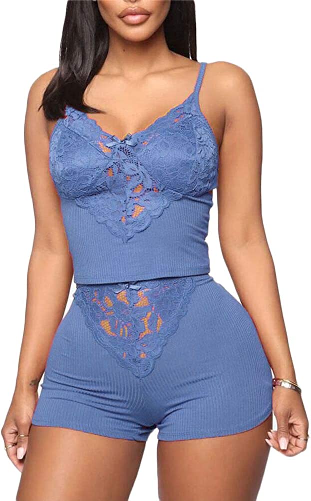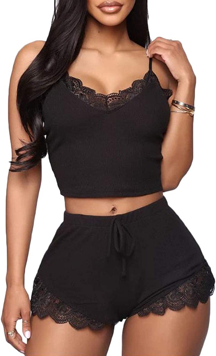 RUEWEY Women's V-Neck Sleeveless Pajamas Set Lace Cami Set with Short Pants Sleepwear PJ Set Nightwear