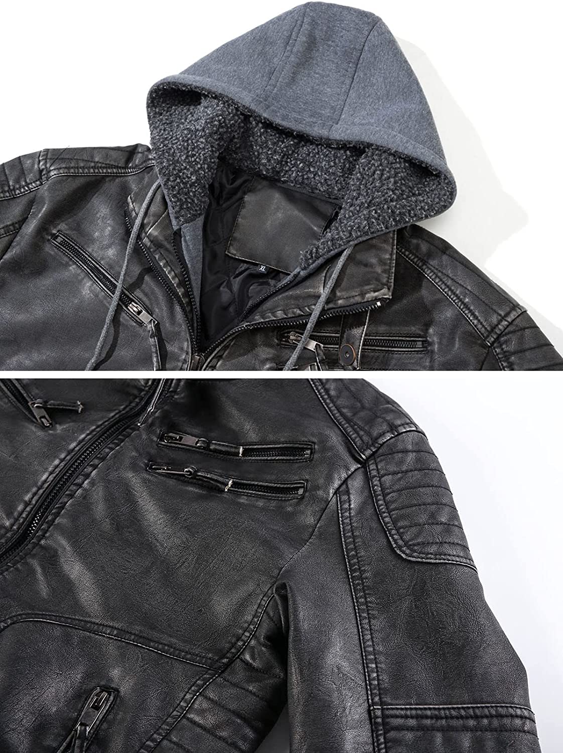 Removable knitted hood with placket and out zip closure placket provide great wind resistant, and can be worn as a stand collar motorcycle jacket