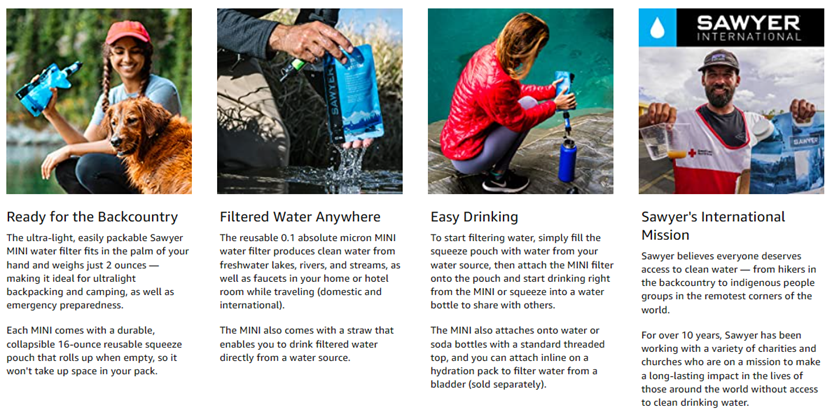 The versatile MINI attaches to the included drinking pouch, standard disposable water bottles, and hydration packs — and you can drink directly from a water source with the included drinking straw.