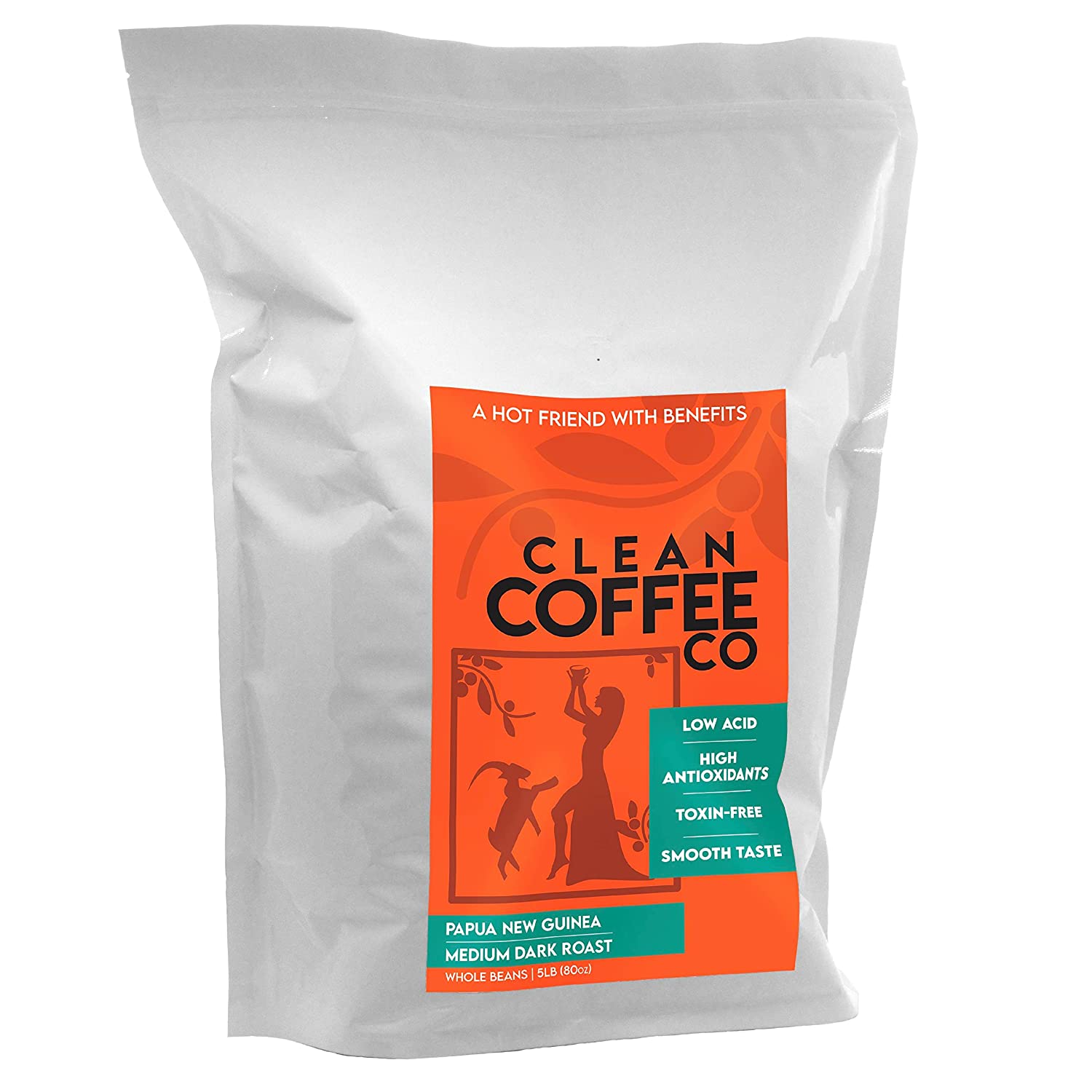 Clean Coffee Co. | Low Acid Coffee, 5lbs Bag Whole Bean Coffee | Medium Roast from Papua New Guinea | Toxin and Mold Free, Antioxidant Rich, Smooth Taste for Espresso, French Press, or Iced Coffee