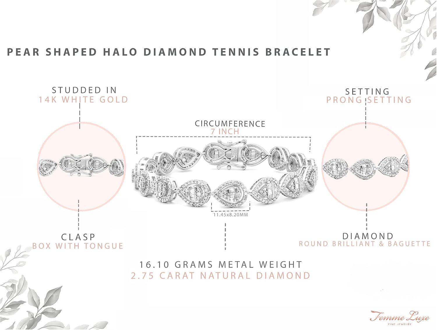 Femme Luxe Pear Shaped Halo Diamond Tennis Bracelet (2.75 Carats, G-H Color, I2-I3 Clarity), 14K White Gold, Giftable Jewelry