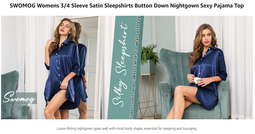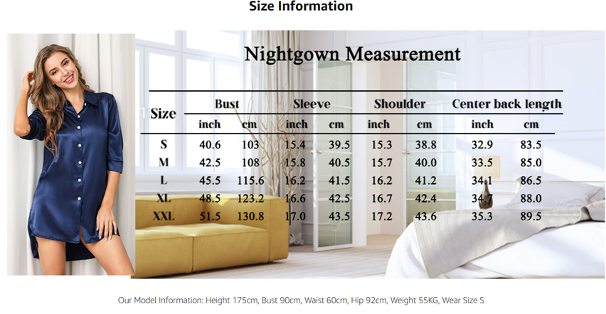 ?SILKY SMOOTH FABRIC:The womens satin night shirts made of high quality fabric,Which is soft,lightweight yet durable,skin friendly and breathable,keeping you cool and comfortable in any season as you sleep or relax