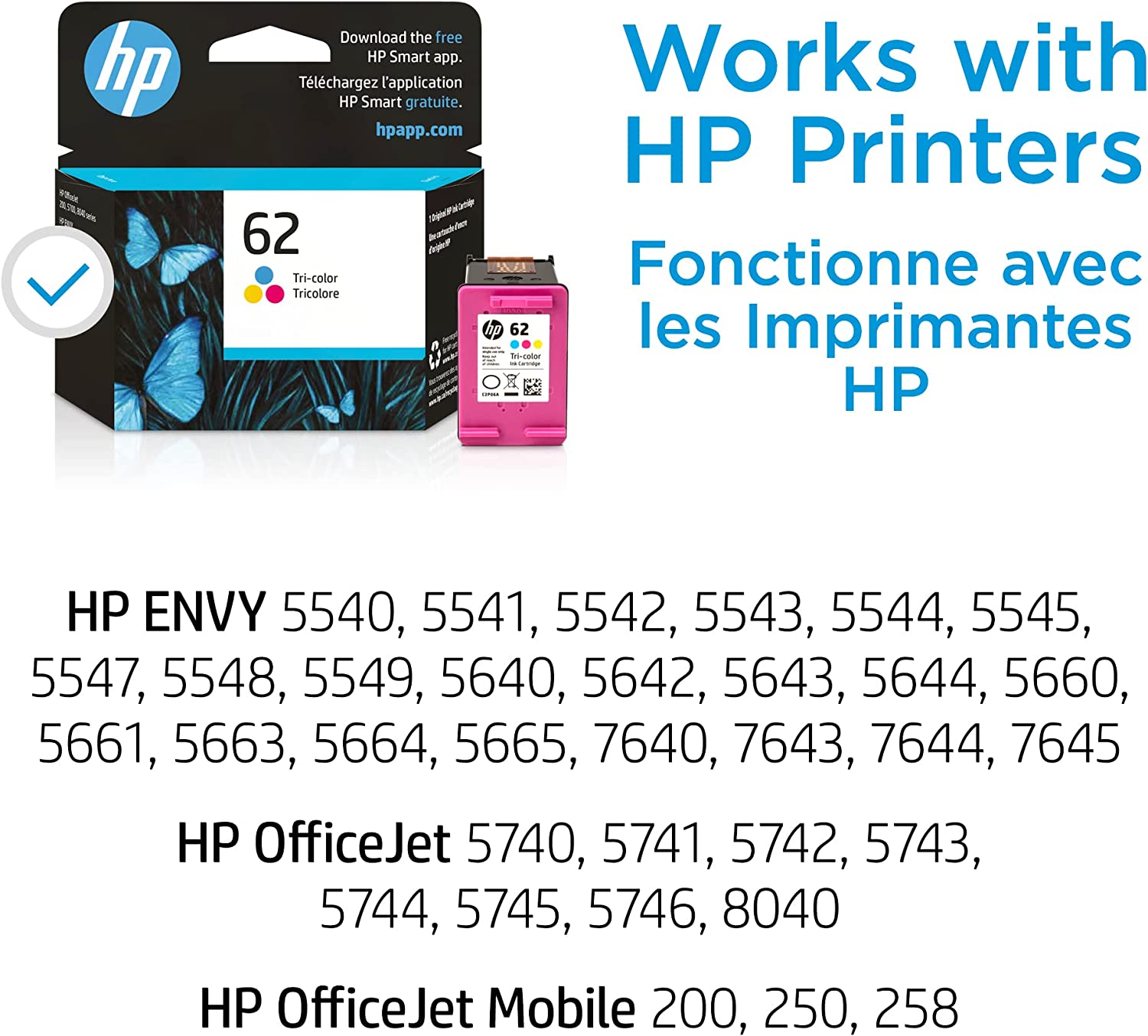 HP 62 Tri-color Ink Cartridge | Works with HP ENVY 5540, 5640, 5660, 7640 Series, HP OfficeJet 5740, 8040 Series, HP OfficeJet Mobile 200, 250 Series | Eligible for Instant Ink | C2P06AN