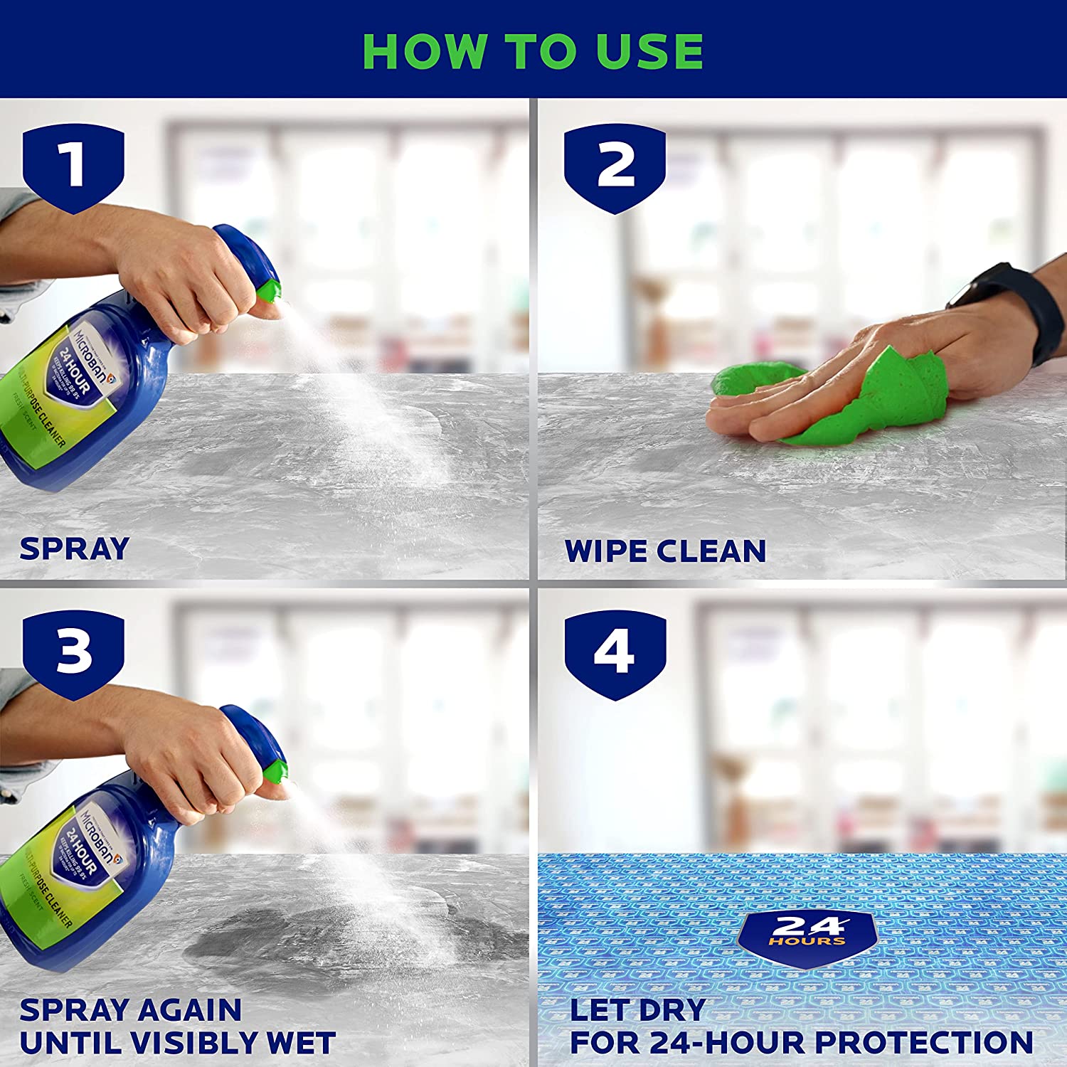 Microban 24 Hour Multi-Purpose Cleaning Spray keeps killing 99.9% of bacteria** for up to 24 Hours, even after multiple touches*, to support a clean and healthy home. This all-purpose sanitizing cleaner is great for every day messes and is suitable for use on all different types of non-food contact hard surfaces, like garbage cans, bathroom sinks, cabinets, etc. Use this multi-purpose spray for an efficient clean. Use around the home and on other high touch areas. This powerful formula penetrates soap scum and greasy soils while reducing odors. Let Microban protect you and your family from harmful germs for a healthy home. *When used as directed **Effective against S. aureus & E. Aerogenes +Effective against bacteria and viruses (Human Coronavirus, Influenza A H1N1, (RSV) Respiratory Syncytial Virus) ++ Effective against Aspergillus niger