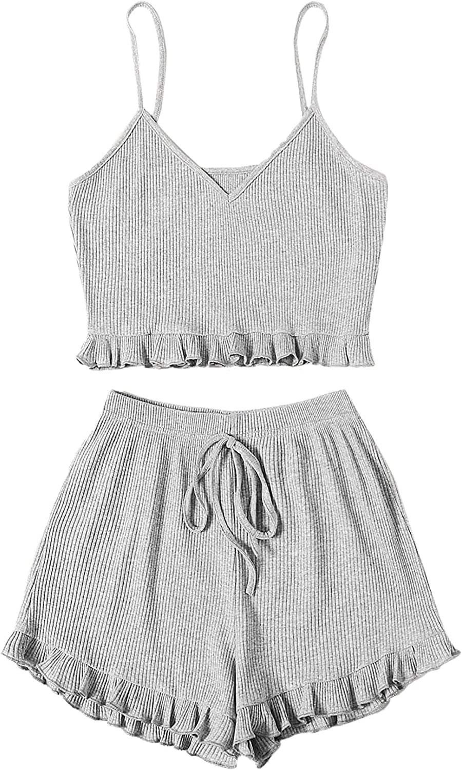 [Feature]: Two piece pajama set for women feature with adjustable spaghetti strap, knit ribbed crop top set, ruffle trim, sexy v neck cami top and elastic waist shorts, sleeveless pjs sets for girls