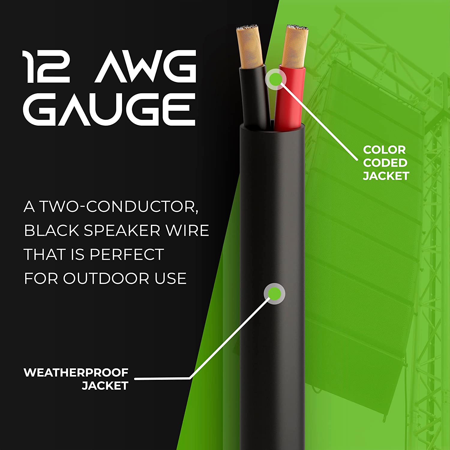 12 GAUGE OUTDOOR BURIAL SPEAKER WIRE - GearIT Speaker Cable copper wires come in 2 conductor stranded copper wire designs. Suitable for outdoor direct burial, in wall, underground, solar, attic, basement and other rough weatherproof environments. Suitable for 12V wire gauge (12 volt wire gauge), but max voltage of 30V.