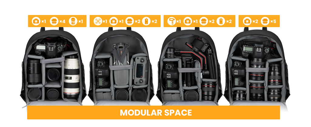 Dedicated camera compartment with removable padded dividers; fits 1 camera 6 lenses at once. Can be used as a daily backpack just take out the dividers to arrange your various daily goods such as clothes, cellphones, books, and so on.