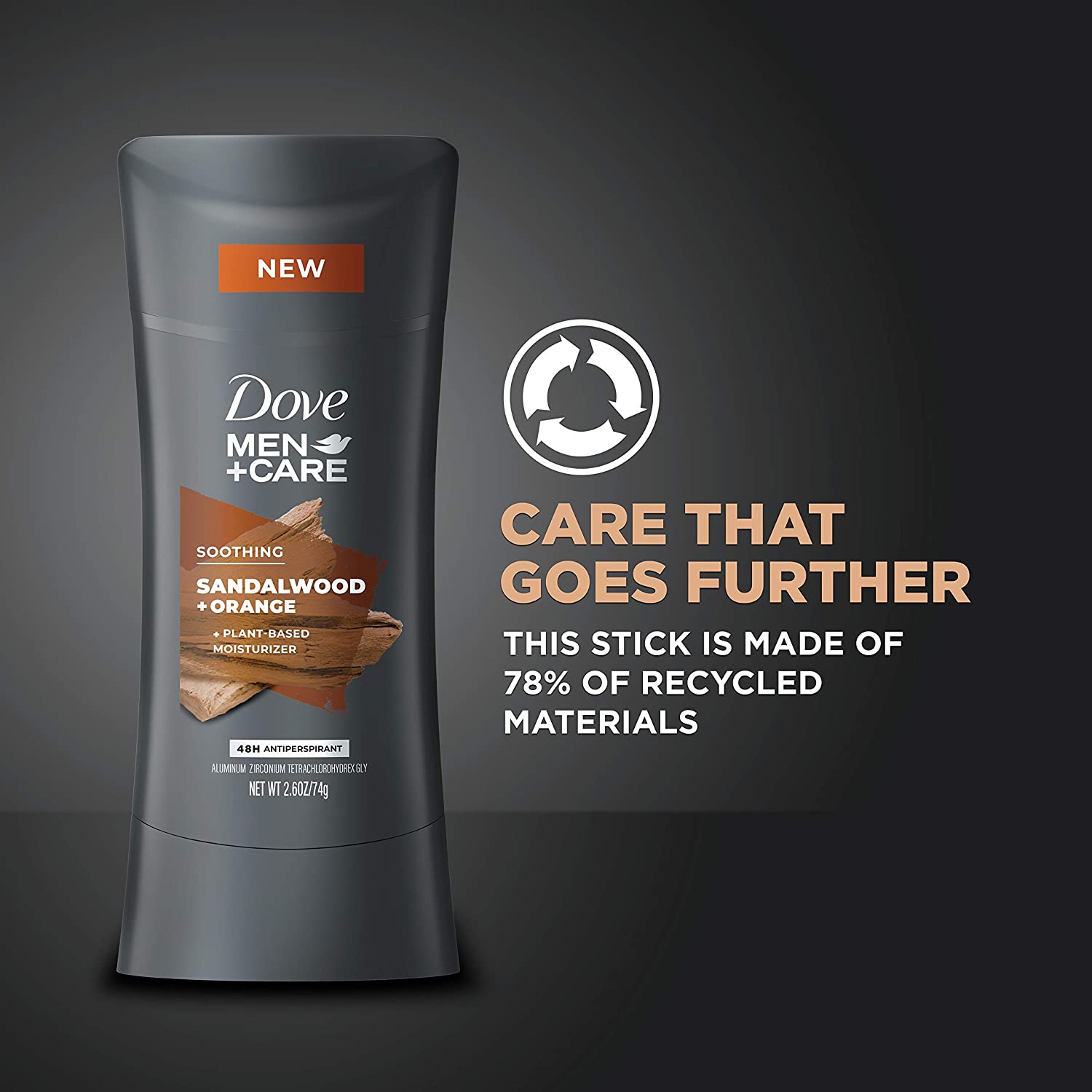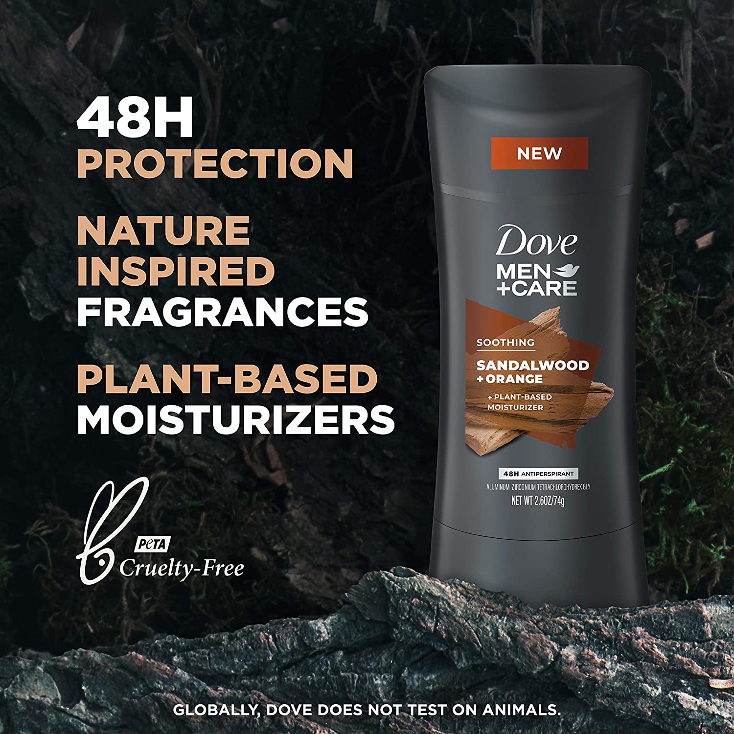 A natural inspired deodorant with 48-hour protection against sweat and odor, and a lasting soothing feeling - that's the Dove Men+Care antiperspirant with Sandalwood and Orange. For men who want protection that works through busy, active days, this antiperspirant deodorant is made to leave you feeling dry for a full 48 hours. This antiperspirant for men is one of the strongest defenses against sweat and odor, with natural essential oil extracts, plant-based moisturizers and the soothing aromas of Sandalwood and Orange. This deodorant offers long-lasting performance and comfort because it's tough on sweat, but not on the skin. Swipe with ease to experience a smooth glide and keep your underarms feeling soothed for the long-lasting protection that you need. You can also rest assured that Dove's global commitment to sustainability means this deodorant is cruelty-free, with no testing done on animals. To complete your grooming routine, explore the entire Dove Men+Care Plant-Based Care range. Whether it's the Dove Men + Care Charcoal Clove Body Wash or the Dove Men + Care Eucalyptus+ Birch, there are many options to pair this deodorant with. You can also choose from Dove Men + Care 0 percent Aluminum deodorant sticks and sprays available in invigorating scents like Lime + Sage and refreshing ones like Eucalyptus + Birch.
