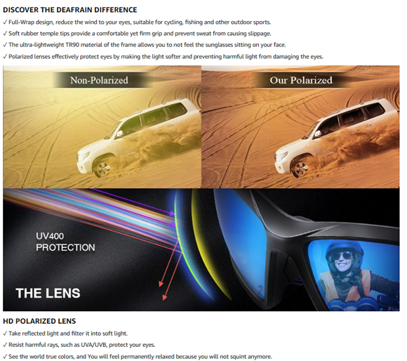 {EXCELLENT HD POLARIZED LENSES} -1.0mm polarized TAC scratch-resistant lenses with 100% UV protection against the sun's harmful rays.DEAFRAIN polarized lenses offer high contrast, perfect clarity and peak visual acuity. Not only perfect for your weekend adventures, but also an excellent choice of your weekday commute.