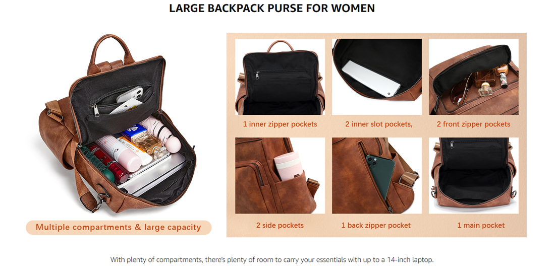 • 【CONSTRUCTION & LARGE CAPACITY】 This leather backpack purse for women adopts a double zipper with a large vertical opening at the top, which is very convenient for loading items. 1 inner zipper pockets, 2 inner slot pockets, 2 front zipper pockets, 2 side pockets, and 1 back zipper pocket. Multiple pockets can keep your things well organized.